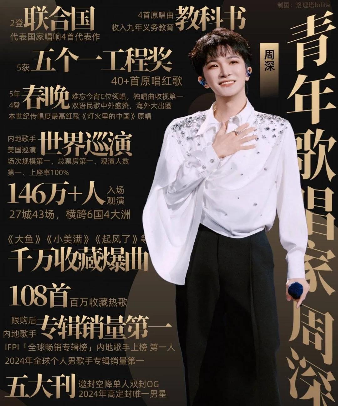 想不到吧, 周深的名头可不仅仅是歌手, 还是央视认证的“青年歌唱家”哦。 虽然有些网友老说get 不到周深的唱腔, 觉得他的歌声有点刺耳, 首次听惊艳,听多感觉很腻。 还有些网友很不认可他演唱会上 那些华美的造型, 觉得有失阳刚之气。 但这些也丝毫不影响他 在歌坛的顶流地位。 他依然用实力与独特, 赢得无数人的热爱与尊重。