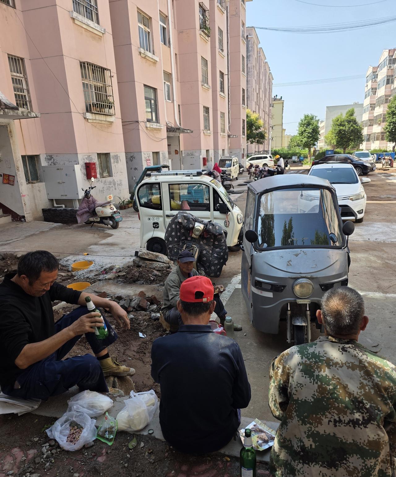 小区里施工的民工…… 中午时,找个空地坐下来吃饭。饭是从家里带来的,有吃馒头的,有吃包子的,有吃火烧的。没有菜,只有从家里带来的咸菜、花生、咸鸭蛋。爱喝酒的买瓶啤酒当水喝。 一边吃一边嘻嘻哈哈。我站在一边听他们聊天,他们聊今年的秋收和预计粮食能卖多少钱,聊养老金每个月接近200元了,很知足,也聊俄乌战争和9.3大阅兵,说我们国家现在确实强大了,没人敢欺负了。 小区改造,他们已经在这里干了40多天,可能还要干俩月。他们根据天数领工钱,干的天数越多,他们挣的工钱就越多。在一个工地多干些日子,这是每个打工人的愿望,因为一个工程结束了,下一个工程人家为此找他们去做。