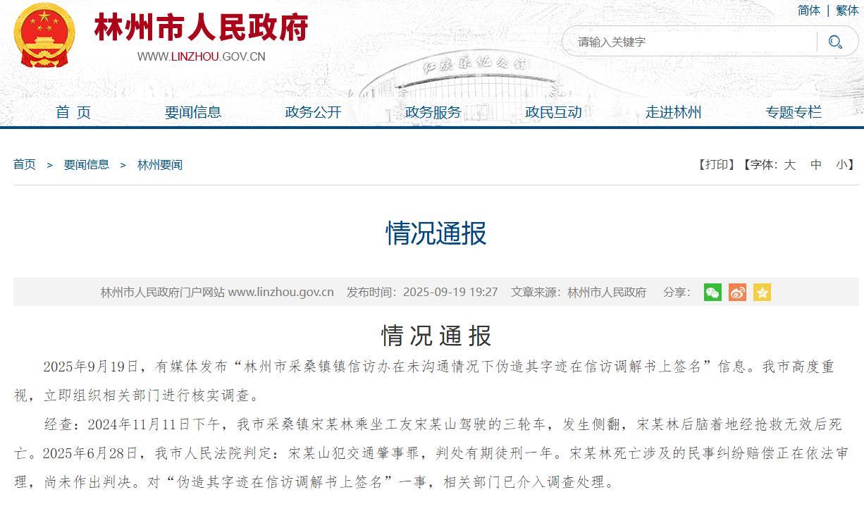 经查:2024年11月11日下午,该市采桑镇宋某林乘坐工友宋某山驾驶的三轮车,发生侧翻,宋某林后脑着地经抢救无效后死亡。2025年6月28日,该市人民法院判定:宋某山犯交通肇事罪,判处有期徒刑一年。宋某林死亡涉及的民事纠纷赔偿正在依法审理,尚未作出判决。对“伪造其字迹在信访调解书上签名”一事,相关部门已介入调查处理。