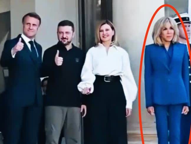 马克龙又惹妻子生气了! 马克龙和泽连斯基会面时,感觉马克龙的妻子表情很严肃,很生气,独自站在另一边! 她们三个紧挨着站在一起,表情都很自然,又说又笑,很开心! 泽连斯基抓紧打招呼安慰一下!
