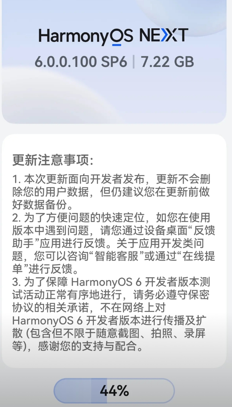 经过层层关卡,终于升级成鸿蒙6了。新系统叫HarmonyOS 6.0 Developer,没有了NEXT标识了。 我是从鸿蒙5升级上来的,升级包7.22G,没有很多人所说的十几个G。升级后的版本号是6.0.0.100 SP6 ,API 版本 6.0.0(20) Beta5。 希望新系统越来越好用。