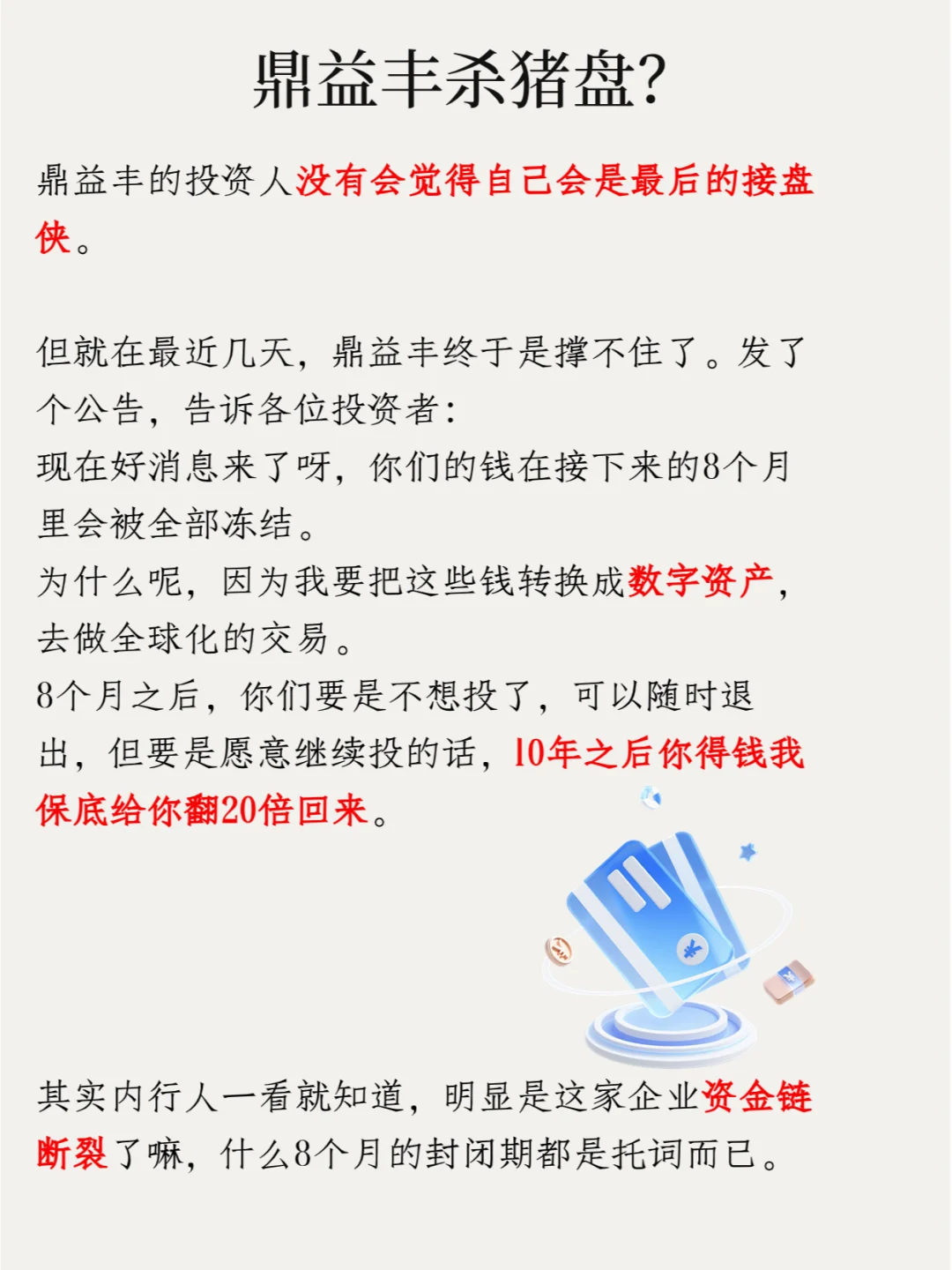 但就在最近几天,鼎益丰终于是撑不住了。发了个公告,告诉各位投资者:现在好消息来了呀,你们的钱在接下来的8个月里会被全部冻结。为什么呢,因为我要把这些钱转换成数字资产,去做全球化的交易。8个月之后,你们要是不想投了,可以随时退出,但要是愿意继续投的话,10年之后你得钱我保底给你翻20倍回来。
