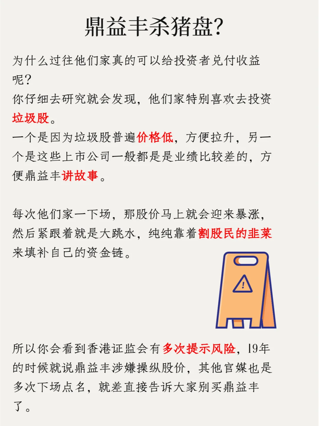 为什么过往他们家真的可以给投资者兑付收益呢?你仔细去研究就会发现,他们家特别喜欢去投资垃圾股。一个是因为垃圾股普遍价格低,方便拉升,另一个是这些上市公司一般都是是业绩比较差的,方便鼎益丰讲故事。