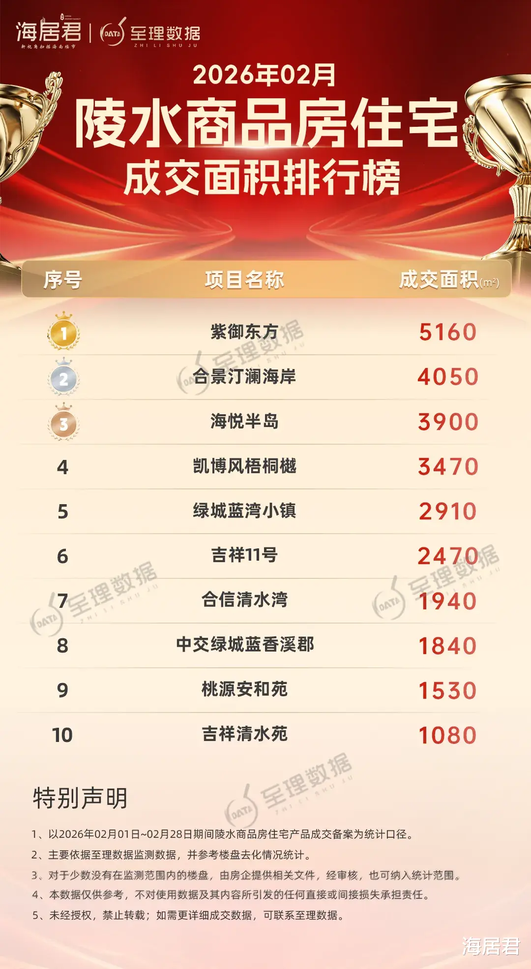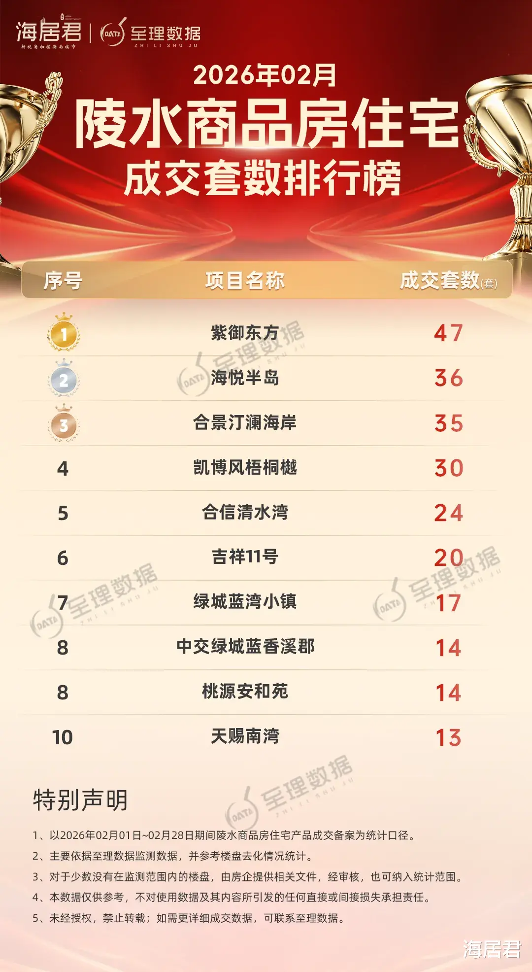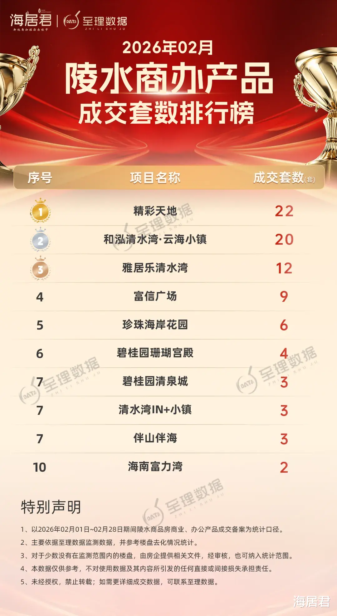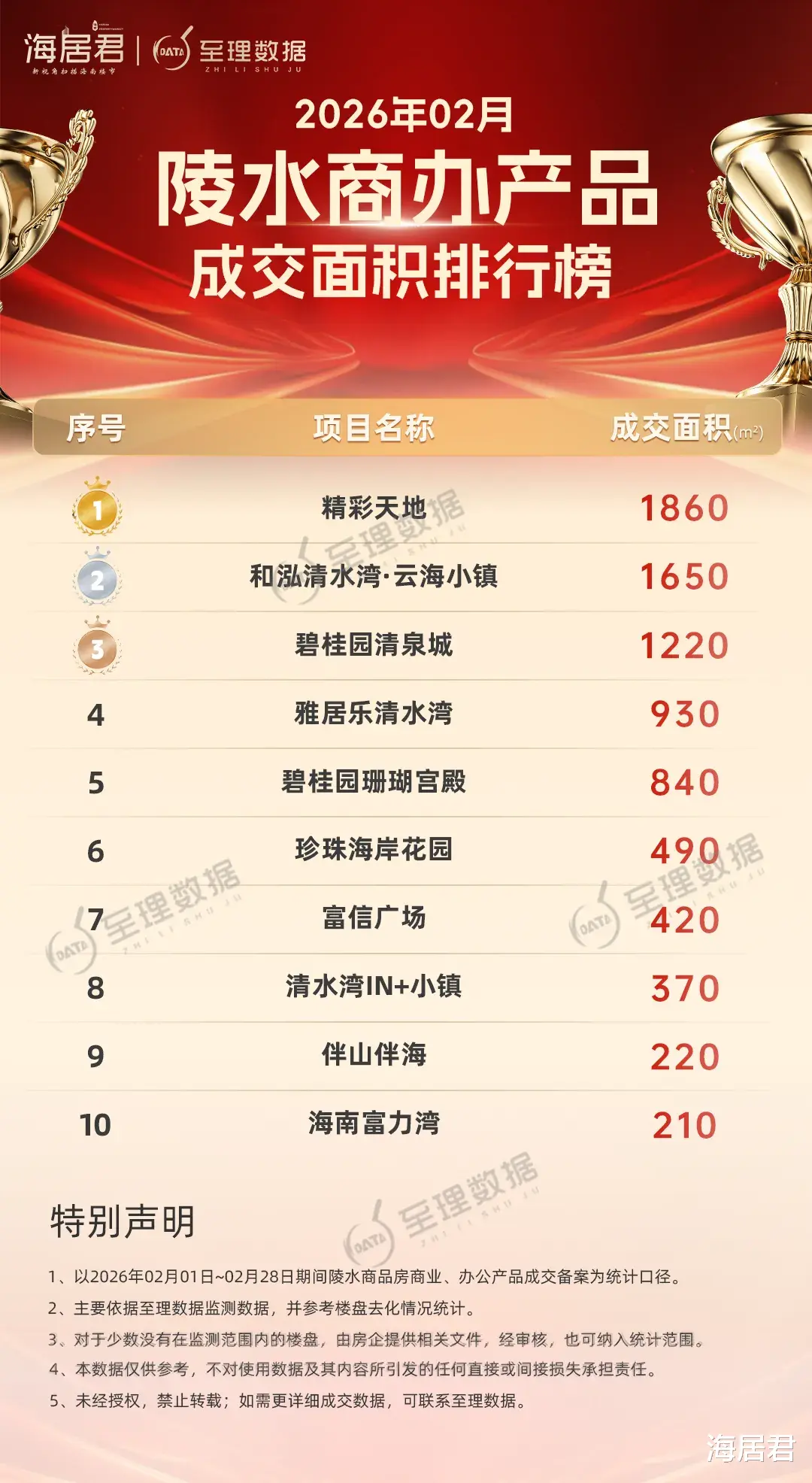 海居君旗下“至理数据”海南房地产大数据平台显示:2026年2月份,陵水商品房『住宅』成交334套、成交面积约3.73万方,揽金超7亿元。