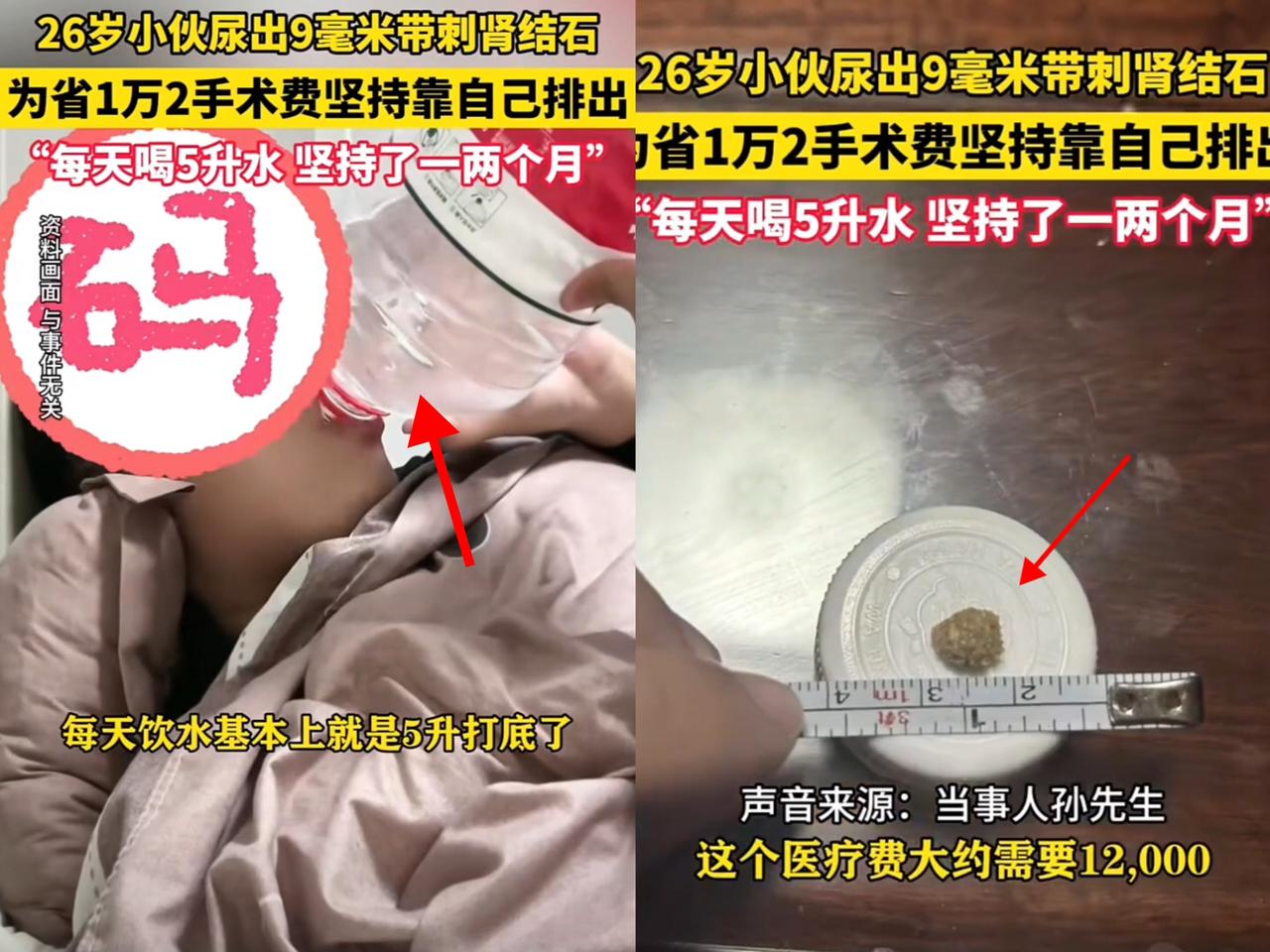 上海孙先生这波操作真的把我看惊了!查出卡在输尿管的9毫米肾结石,医生说手术要一万二,他又怕手术又心疼钱,居然咬牙靠自己调理硬把结石排出来了! 他每天抱着5升大桶水喝到撑,不管刮风下雨,早上雷打不动跑2到5公里,就这么坚持了三个月。 某天上厕所时,突然感觉一阵轻松,低头一看,那颗让他疼到冒冷汗的结石居然真的排出来了! 但必须说句实在的,孙先生能成功纯属运气好。 要知道9毫米的结石自行排出的概率特别低,要是中途卡得更严重。 引发肾积水甚至感染,可比花钱做手术危险多了。 所以大家查出结石可别学他硬扛,该听医生的还是得听! 你们身边有没有人试过类似的调理方法?最后效果咋样啊?肾结石 尿酸肾结石