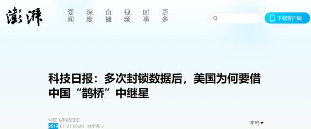 澎湃新闻在2019-01-21关于《科技日报:多次封锁数据后,美国为何要借中国“鹊桥”中继星》的报道