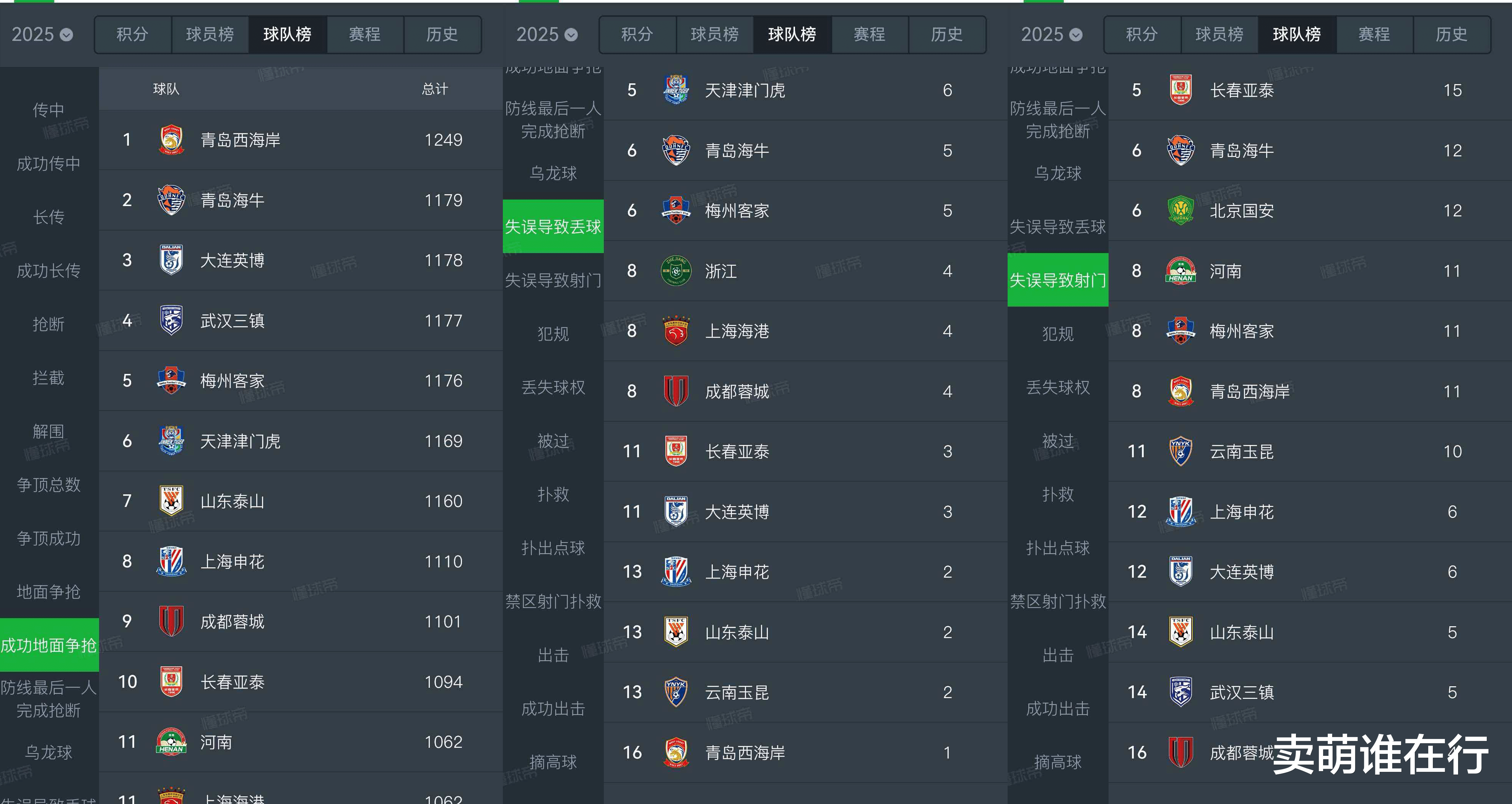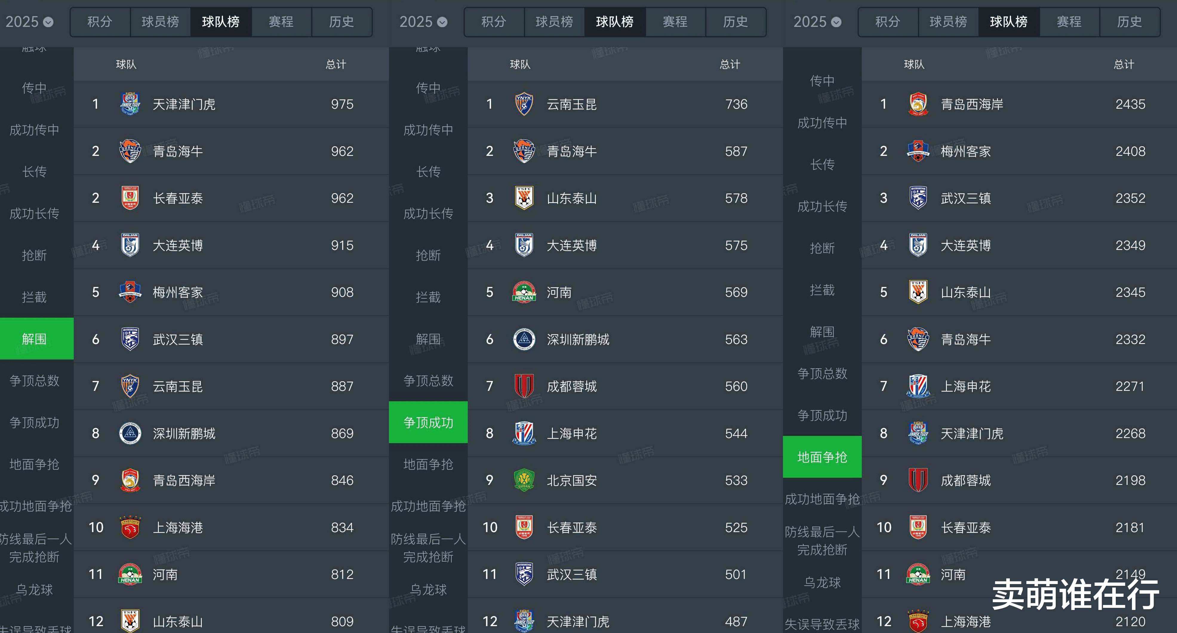 在丢球数比较少的背后,是25赛季大连全队抢断数、争顶次数、守门员出击摘控球高居中超第二。