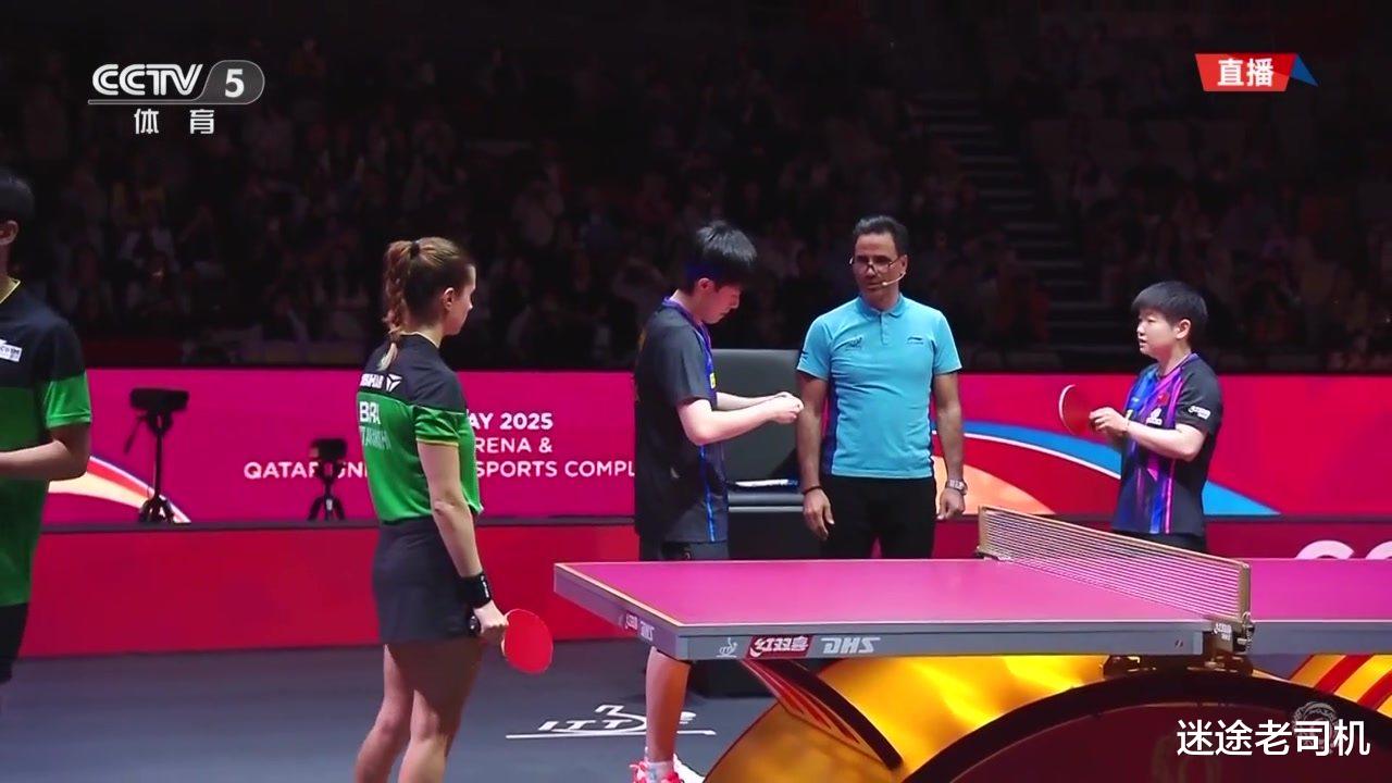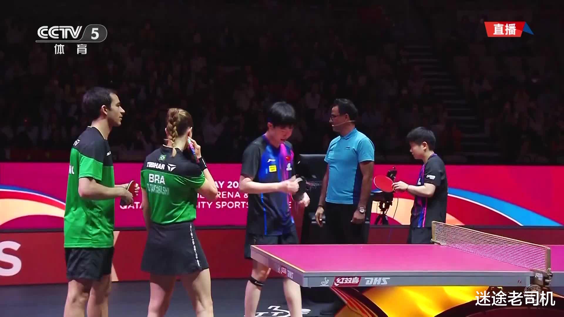 比赛结果:王楚钦使用备用球拍与搭档孙颖莎以 3:0 战胜巴西组合,晋级 16 强。赛后备用球拍检测通过,成绩有效。