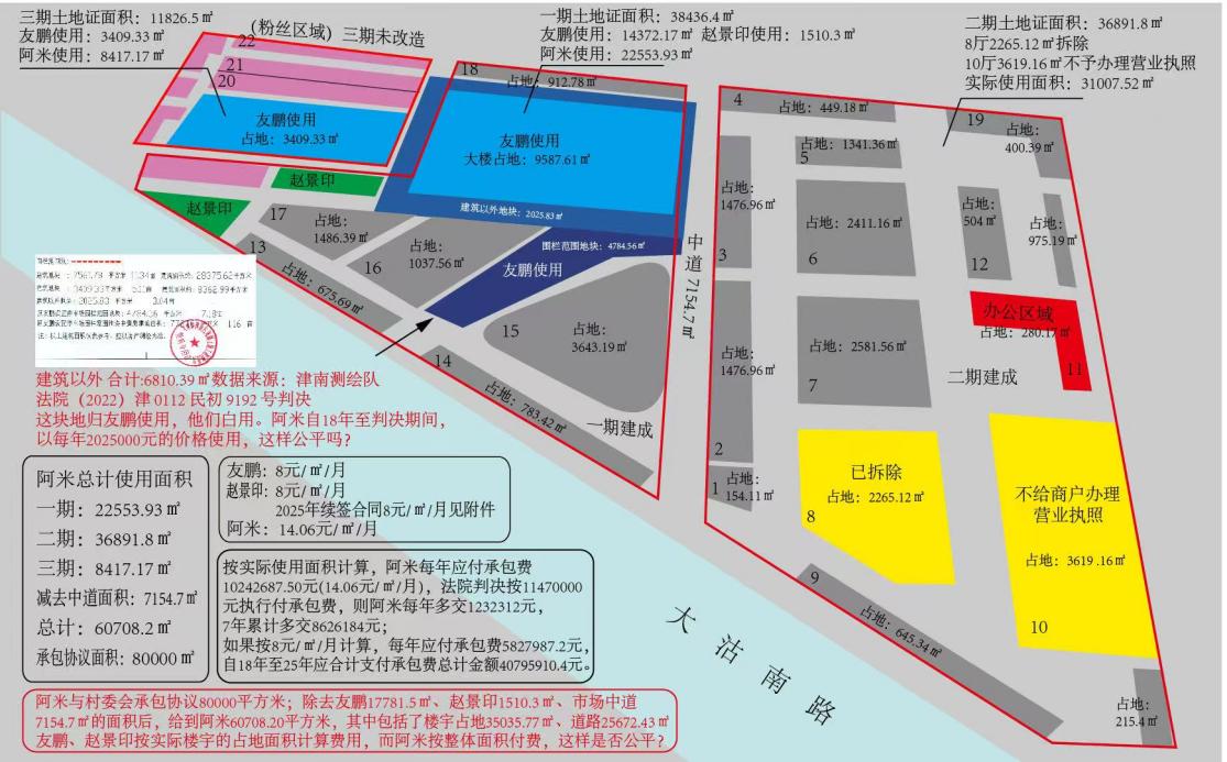 更严重的是,相关人员擅自将市场内赵某印使用的数千平米区域以20年前低价续租20年,拒绝移交阿米公司经营,造成企业上千万元经济损失。此外,二期地块中2265.12平米的8号厅已被拆除、3619.16平米的10号厅因无法办理营业执照无法运营,但这两部分面积的承包费未获减免。2022年的诉讼虽判决承包费每年酌减15%,但阿米公司认为该标准未匹配实际面积差异,应重新精准核算。