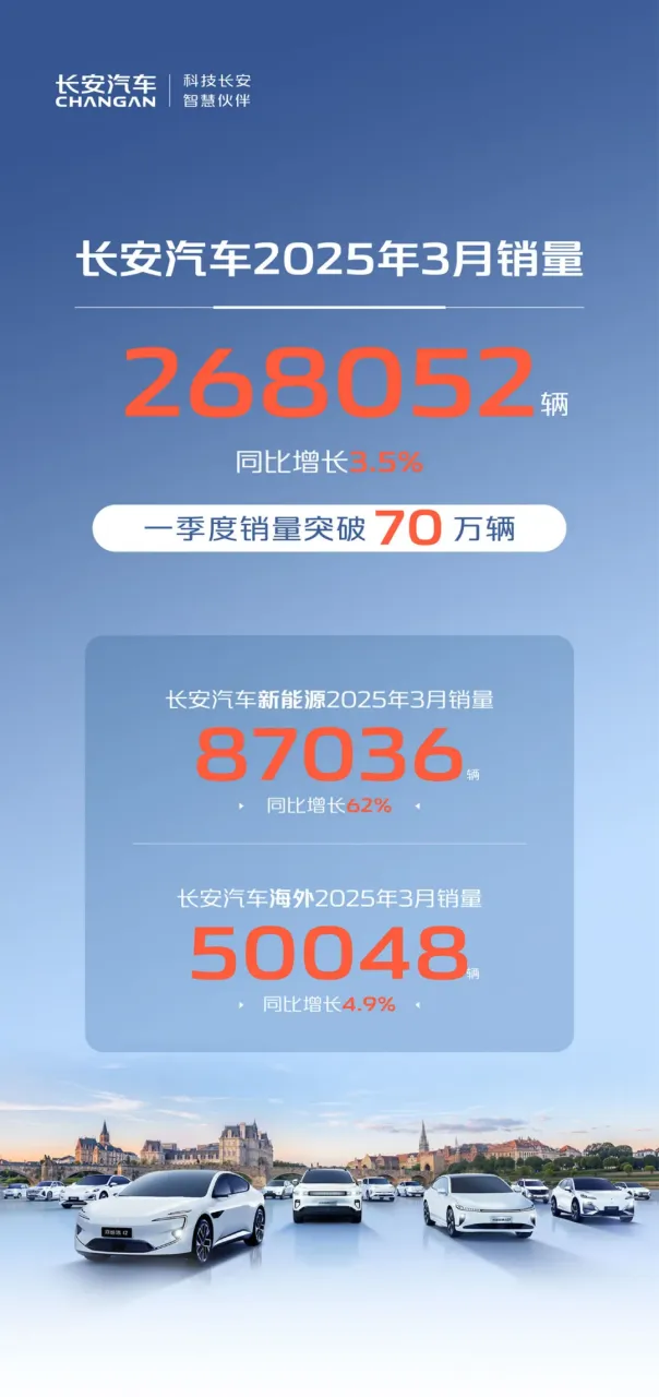 市场表现印证了长安数智技术的领先性:2024年,长安汽车全年销量达到268.3万辆,同比增长5.1%,创下近七年来的新高,并实现连续五年同比正增长。而在刚刚公布的销量成绩单中,长安汽车3月新能源销量突破8万辆,一季度销量突破70万辆,交出了亮眼的第一季度收官成绩。