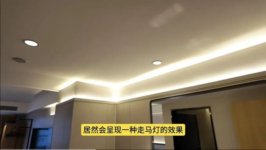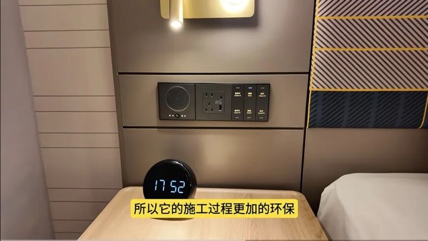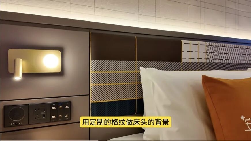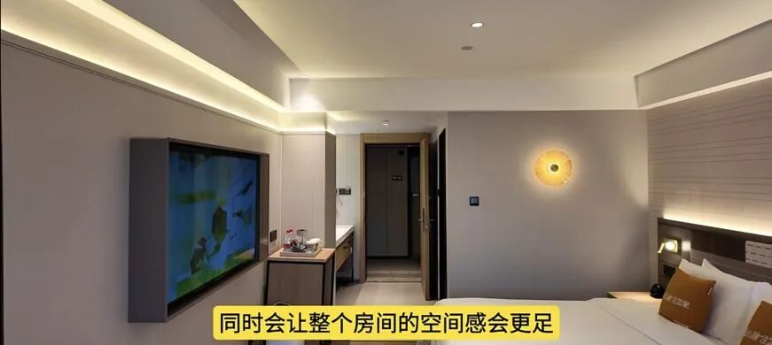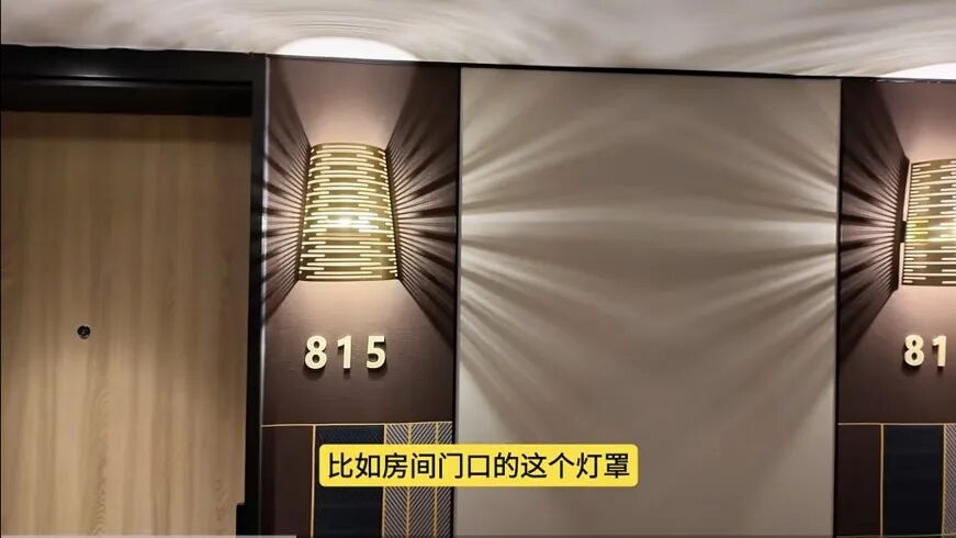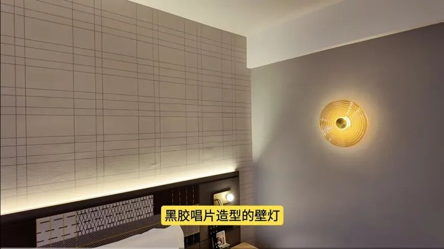 进门第一感觉整体氛围营造更加精致,特别是灯光氛围的营造,比如房间门口的这个灯罩用金色穿孔的造型来提升质感,散射出来的灯光有点像黑胶唱片,房间的灯带从走廊一直贯穿到里面,插上房卡之后居然会呈现一种走马灯的效果,非常有仪式感。
