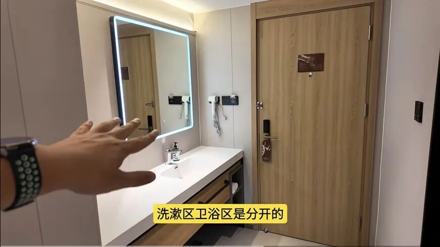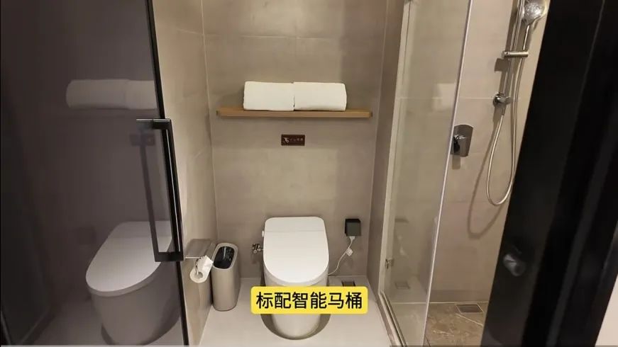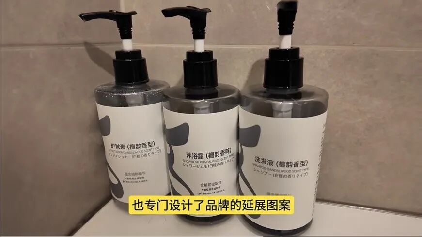 洗漱区卫浴区是分开的,更合理的利用了空间,洗漱用品的外包装也专门设计了品牌的延展图案,标配智能马桶,花洒开关的操作也更加的简单。