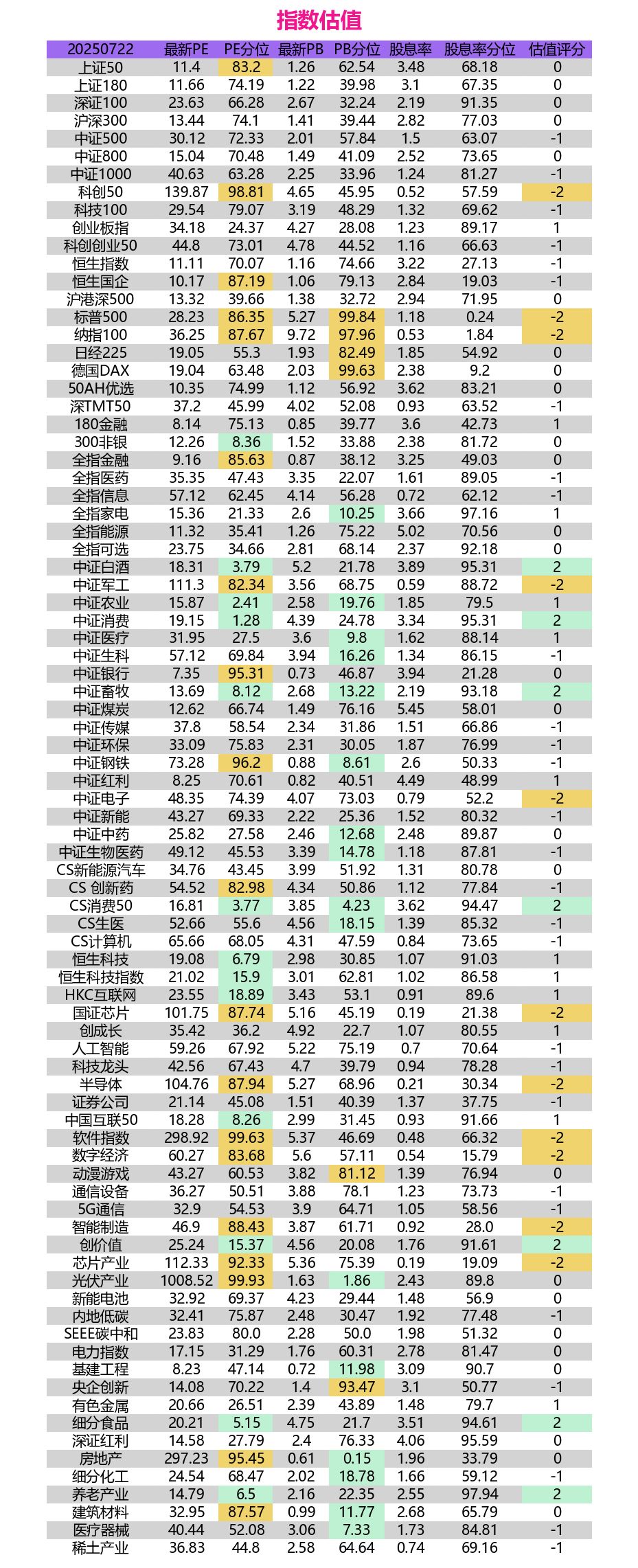 高估值成长板块: 科创50指数PE分位高达98.81%,创业板指PE分位也相对较高,但PB分位相对较低,显示这些成长板块估值较高,投资需谨慎。科创创业50指数的情况类似,高估值意味着高风险,投资者需结合自身风险承受能力进行决策。