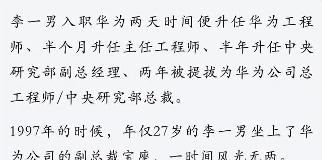 在进入华为短短两个月的时间,就成为了华为公司的主任工程师,两年后,李一男成为了郑宝用之后,27岁就成为了华为公司的最年轻的副总裁。