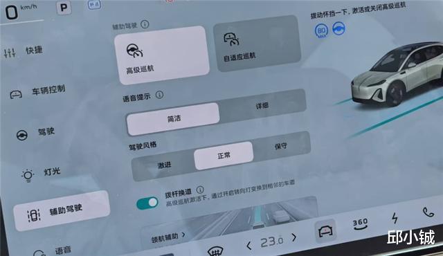 上文我们提到,红旗天工06驾驶舱设计得十分简洁,那么怎样才能快速找到切换领航辅助模式的功能键呢?一种办法是在中控大屏里操作,另外一个更加适合行驶过程中的办法就是方向盘右侧挡杆快速向下连拨两次,即可进入领航辅助模式。