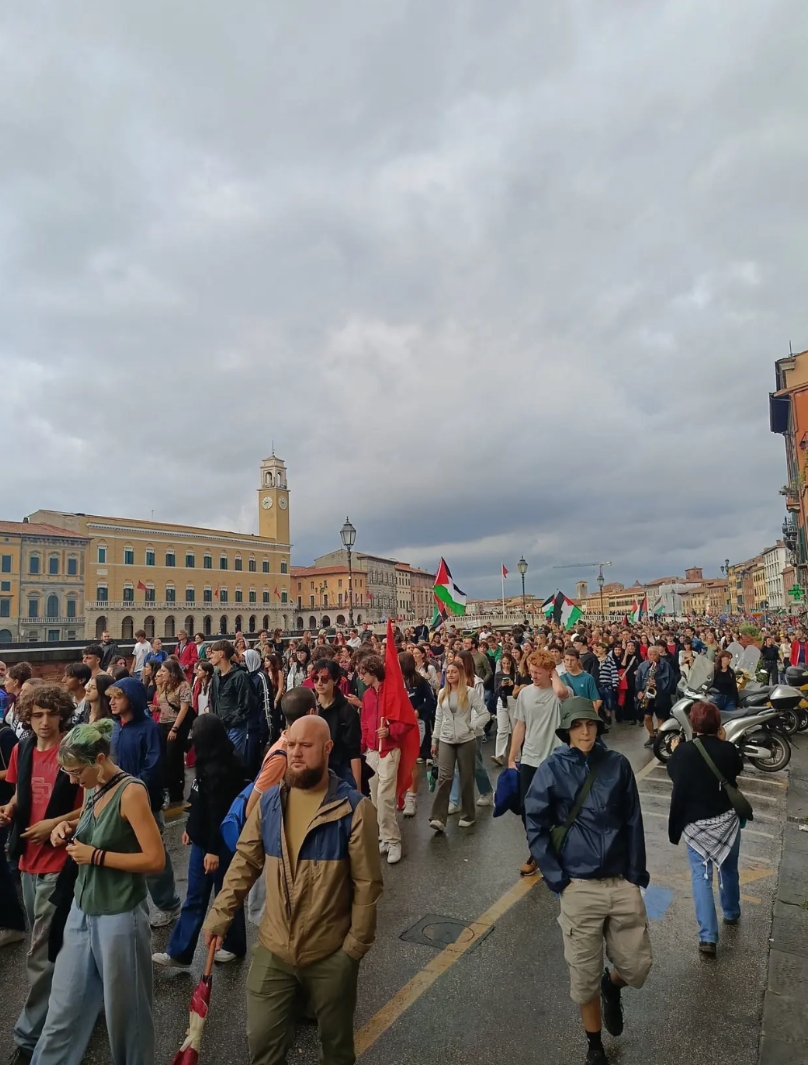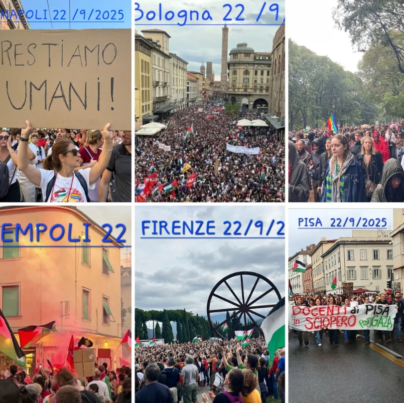 今天,整个意大利的主要港口被工人封锁了海上交通,阻止运往以色列的武器通过。意大利80座城市的街头,正在持续24小时的罢工,以支持巴勒斯坦和加沙。从列车线路、港口船只、学校到商铺,今天的意大利全部停止。这次罢工由意大利工人工会牵头,多个意大利工会组织参与,要求意大利停止向以色列出售武器、实施制裁,并以制止以色列的种族灭绝为首要目标。