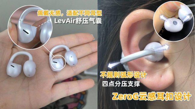 这款耳机佩戴体验很好,单耳仅4.5g,上耳几乎无存在感,久戴无压迫感。耳扣设计灵活,能适配不同耳廓形状,运动时佩戴稳固不易掉落,跑步、瑜伽等场景都能放心使用。