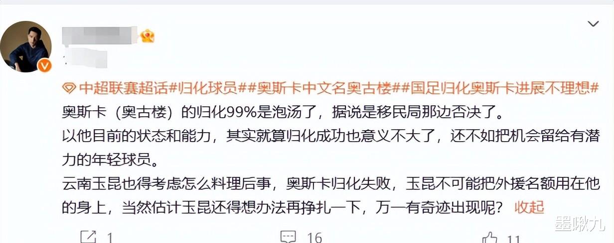 据悉,由于无法提供完整的退籍证明材料,奥斯卡的入籍申请最终被中国移民局驳回。这对于投入巨资引进奥斯卡的云南玉昆俱乐部来说,无疑是一个沉重的打击。原本俱乐部计划将奥斯卡作为本土球员注册,如今不得不面临调整外援名额的尴尬局面。