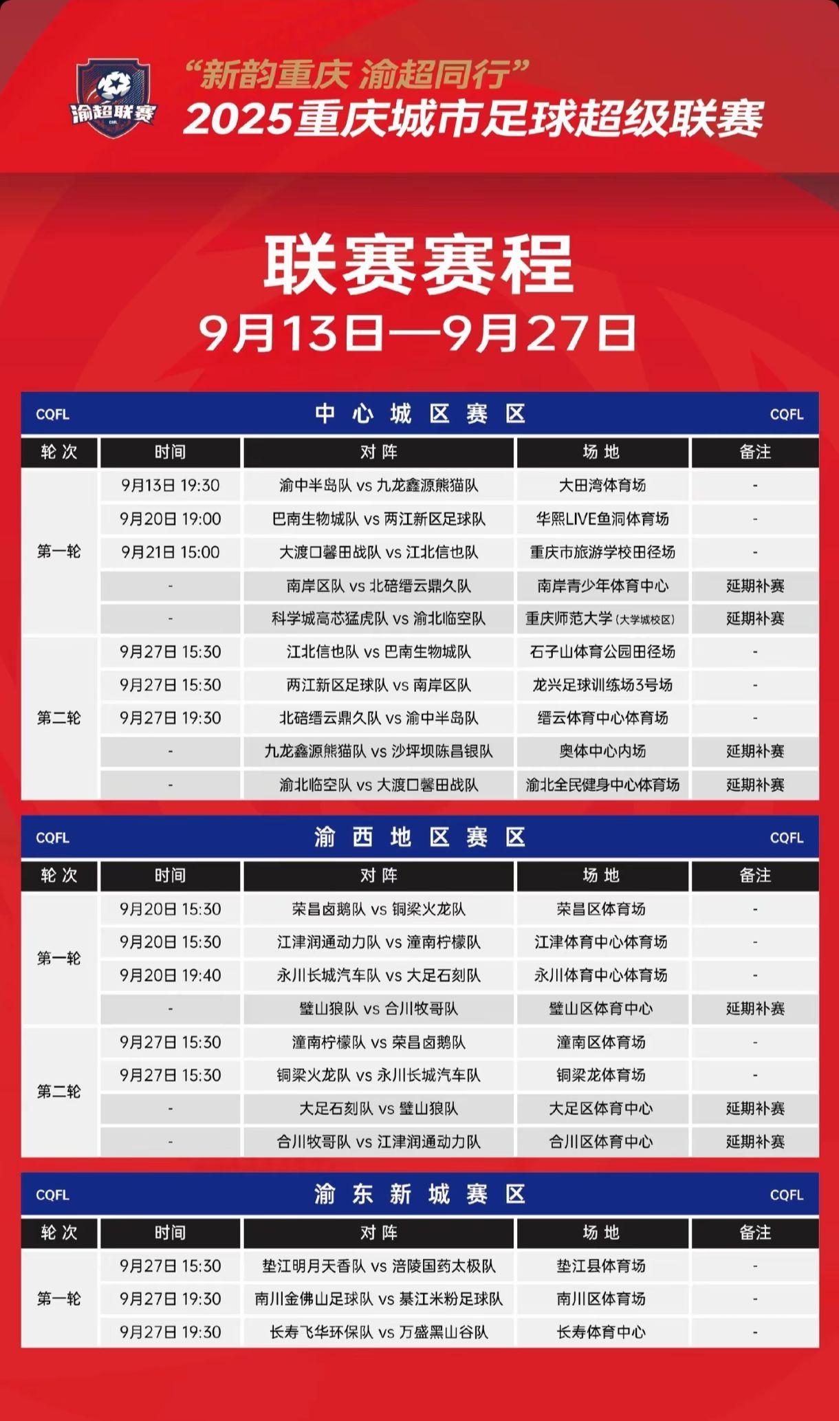 渝超联赛第一轮和第二轮赛程时间江津润通动力队vs潼南柠檬队9月20...