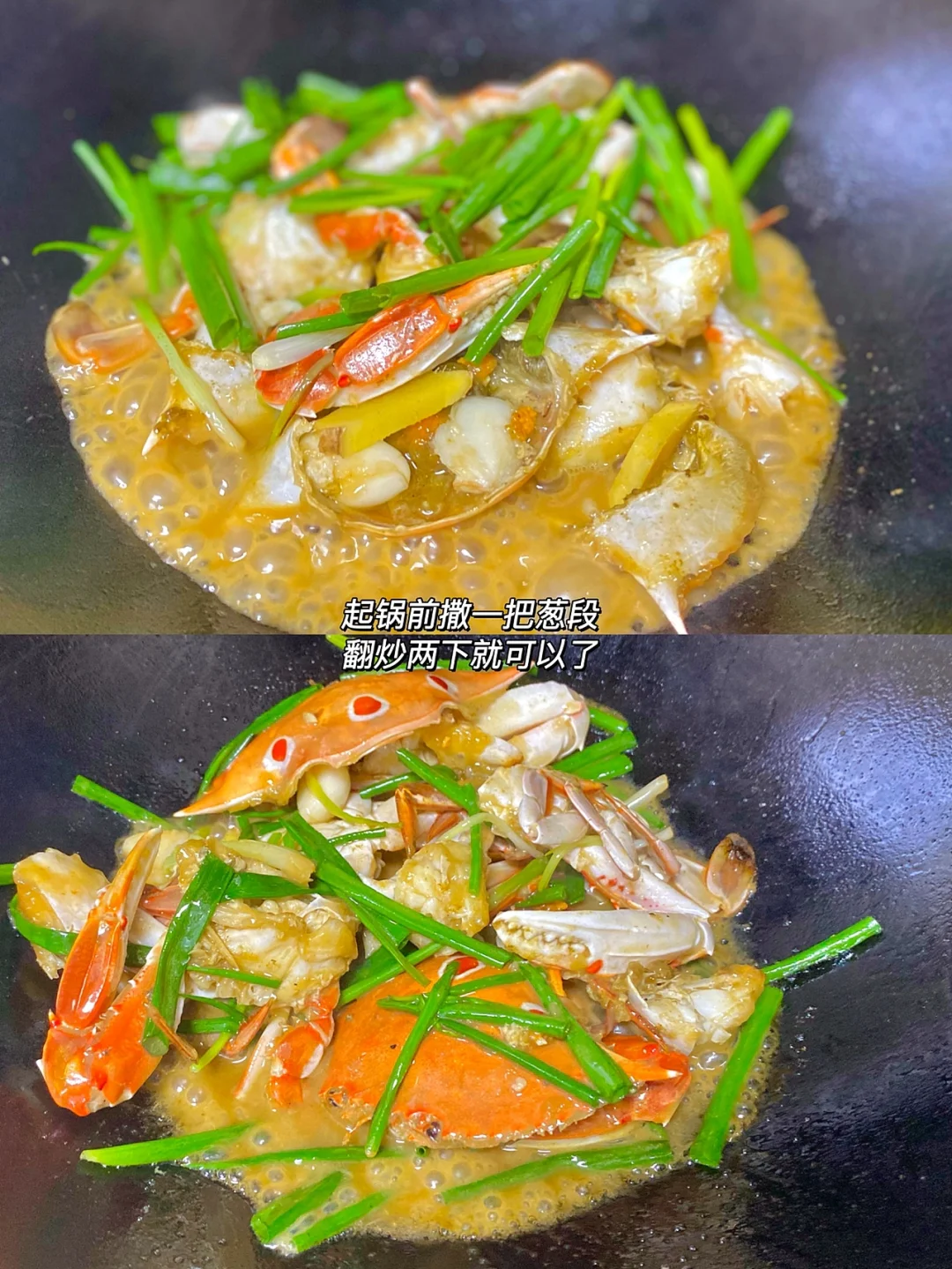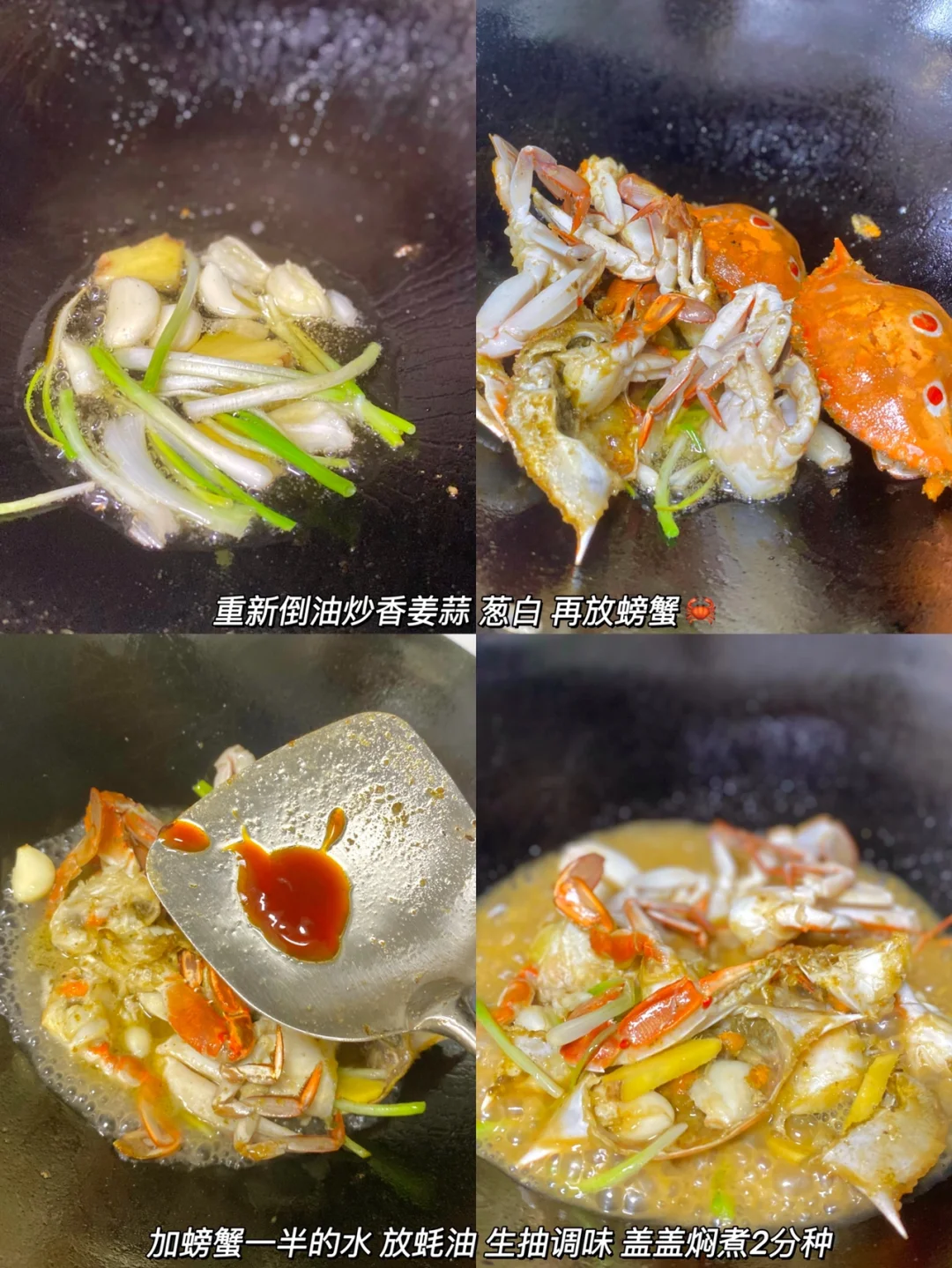 3⃣️:锅里重新倒油,煸香姜蒜 葱白,倒入螃蟹翻炒几下 ,沿着锅边倒一勺米酒,加小半碗水 一小勺蚝油,生抽炒几下,再盖锅盖焖煮两分钟。起锅前撒一把葱段 炒匀