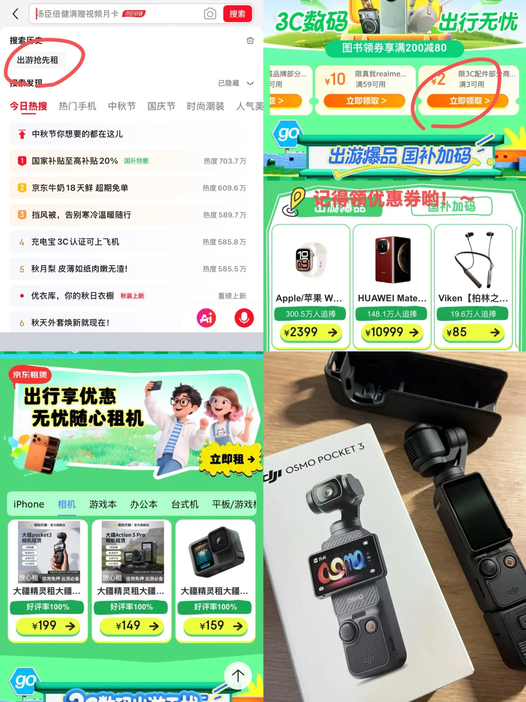 ❶ 打开京东直接搜索"出游抢先租"进入活动会场