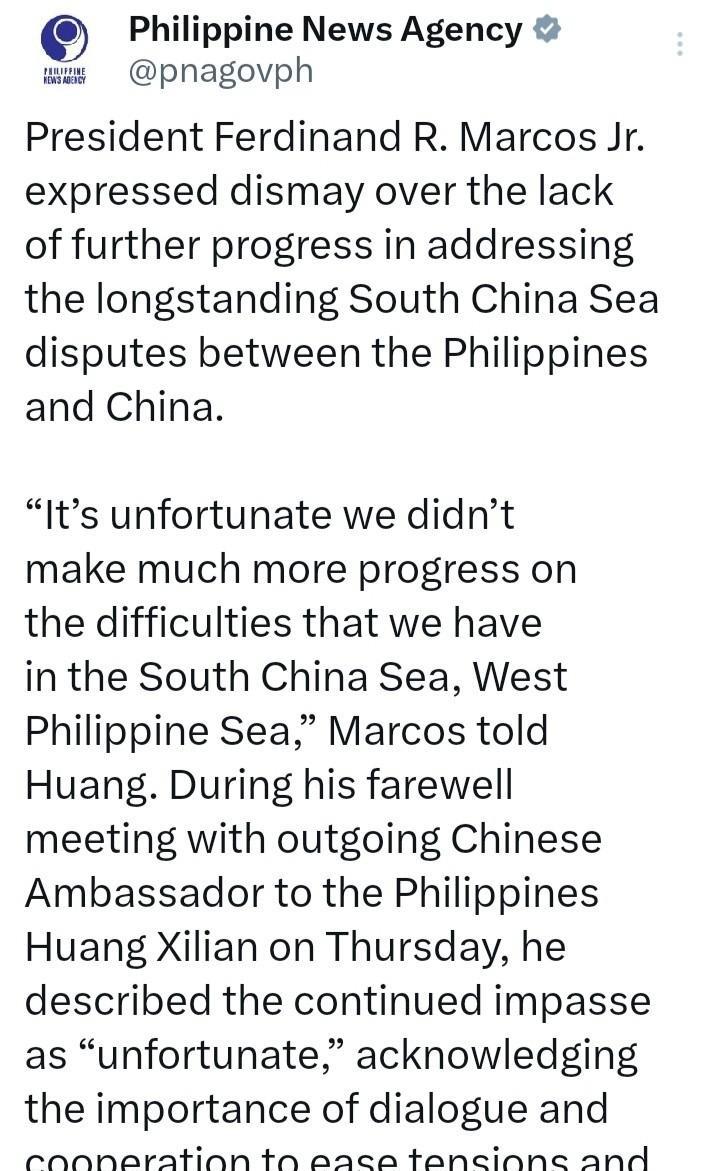 送别中方大使时,马科斯突然要求给北京带个话,相当于主动向中国求和,现场各国记者都十分不解。 这番话与此前菲方在南海议题上的强硬姿态形成反差,不仅让现场的菲美记者感到意外,也让中菲关系的互动多了一层新的解读空间。 这场送别会晤原本按照常规流程进行。黄溪连大使任期内,中菲之间曾就经贸、农业、基础设施建设等领域展开多项合作,会晤中双方也回顾了这些合作成果,包括马尼拉轻轨 3 号线延长线项目的推进、杂交水稻技术在菲推广的进展等。 就在交流接近尾声时,马科斯突然转向南海议题,提出了转达诉求的想法,现场氛围随之发生变化,原本专注记录合作成果的记者们,纷纷调整镜头聚焦这一突发表述。 马科斯当局此前在南海的表态多偏向强硬。2025 年上半年,菲律宾曾多次在仁爱礁、黄岩岛附近海域开展活动,与中国海警船发生过数次对峙,菲方还邀请美国加强在南海的军事存在,允许美军使用更多菲军事基地。 这种姿态让外界普遍认为,菲方会在南海议题上持续与美国保持协同,此次突然强调 “对话与合作”,打破了外界对其政策走向的既有判断,也让区域内国家看到中菲通过外交途径缓解分歧的可能性。 中菲在南海的争议并非没有对话基础。过去几年,双方曾建立南海问题双边磋商机制,在渔业合作、海洋环保、海上搜救等领域达成过共识,比如 2024 年双方签署的《中菲海上渔业合作备忘录》,就曾为渔民作业提供过安全保障框架。 只是这些合作机制在 2025 年初因菲方政策调整而暂时停滞,此次马科斯主动提及对话,相当于释放了重启这些机制的信号。 美国在菲律宾的军事存在,是影响中菲南海互动的重要因素。2025 年美军新增的 4 处菲军事基地中,有 2 处位于靠近南海的区域,美军侦察机、军舰在南海的活动频次也随之增加。 马科斯此次表态,与美国希望菲方在南海 “对华强硬” 的预期形成差异,现场的美国记者在会后第一时间向美方驻菲使馆求证,而美方暂未给出明确回应,这种反应也从侧面说明,马科斯的表述超出了美菲此前的协调范围。 中菲经贸合作的紧密程度,为对话提供了现实支撑。中国是菲律宾最大的贸易伙伴,2025 年前三季度,中菲双边贸易额达到 680 亿美元,菲方出口的香蕉、菠萝等农产品有 40% 销往中国,中国企业在菲投资的工业园区也为当地创造了超过 10 万个就业岗位。 这些经济利益的绑定,让菲方不得不考虑强硬政策可能对经贸合作造成的影响,通过对话缓解南海紧张,也是维护其国内经济稳定的现实需求。 黄溪连大使在回应中表示,会将菲方的诉求如实转达给中国政府。随后中国外交部在例行记者会上提到,中方始终主张通过对话协商解决南海争议,愿在相互尊重的基础上与菲方重启双边磋商机制。 这种积极回应,让马科斯的突发表态有了后续推进的可能,也让区域内国家对中菲关系的缓和抱有期待。