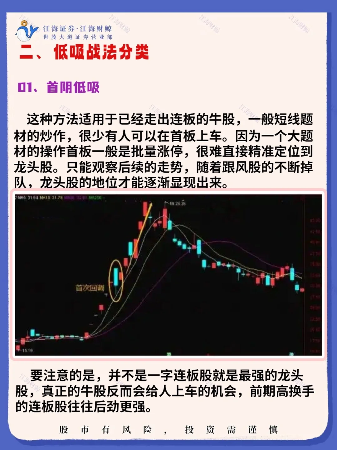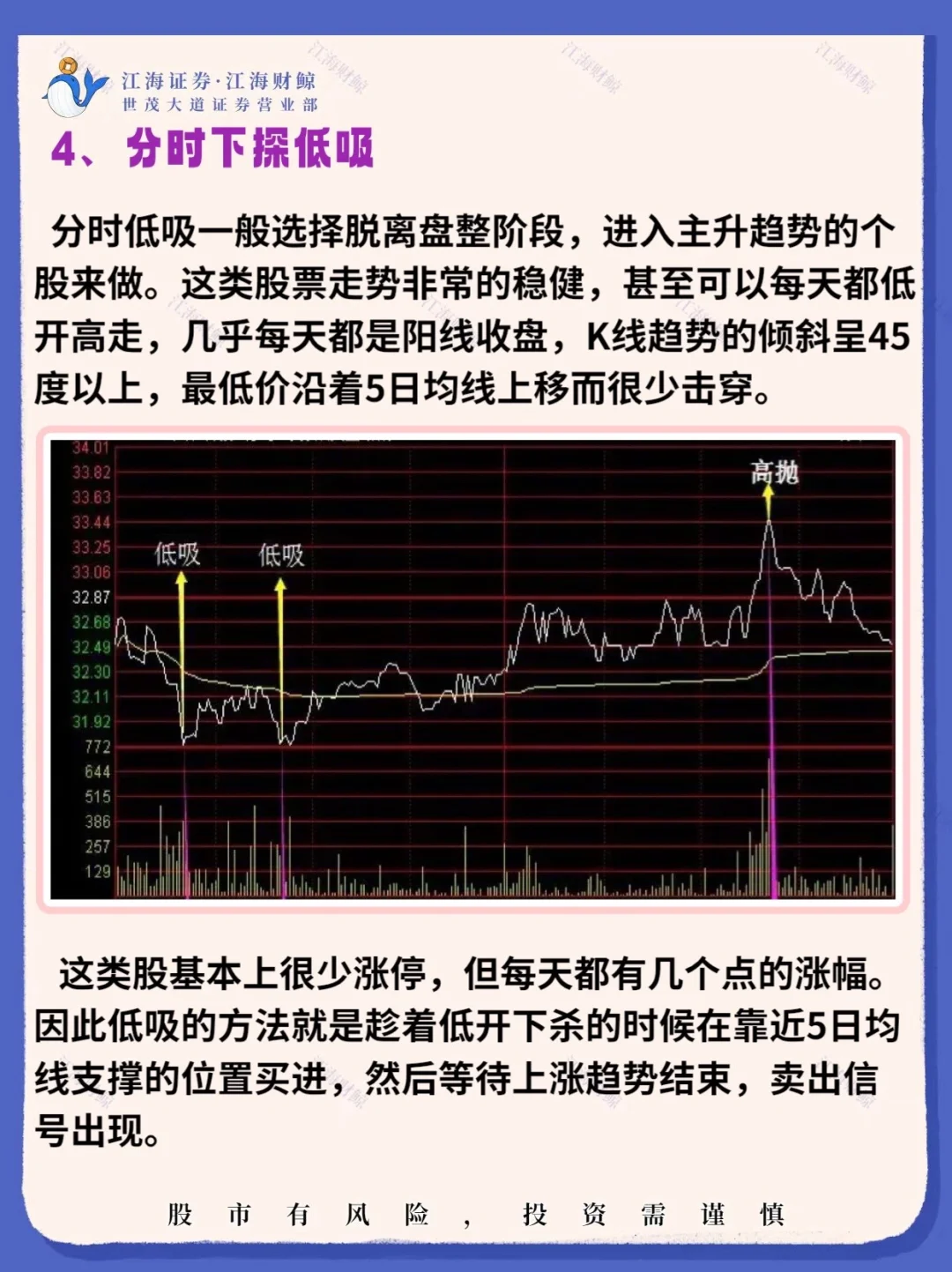 低吸是指在股票走势向下调整的时候低价买进,然后等待调整结束后继续向上拉升。今天我们一起来学习一下,如何作强势股的低吸盈利。 1、强势股选股技巧 2、低吸战法 3、实战技巧之读懂分时图 【6种分时图形态已整理】