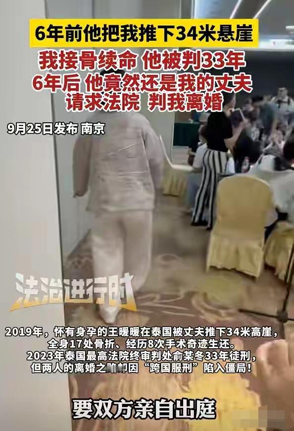 王暖暖真是天选之人!她是被老天选中的,那个完善我们婚姻法的人。 首先她能活下来就是个奇迹。 2019年被于晓东从悬崖边被推下去(大约13层楼高),幸好离地面10米处有棵树缓冲了一下,才没有当场死亡。 悬崖底下很少有人走动,即便是景区工作人员。而王暖暖掉下去1个小时左右,就幸运地被一名游客发现后打了急救电话。 急救车走到岔路口,遇到了刚离开现场的于晓东。没想到他一路尾随到医院。 在医院他多次想弄死王暖暖。要么趁医生不在,以转院为由私自将她推出病房,最后都被医生强硬的态度拒绝,这才让王暖暖保住了性命。 大难不死的王暖暖,死神多次对她网开一面。 如今6年过去了,她却还在为离婚打官司。 于晓东在泰国服刑,而他们的婚姻却一直存续。 像被蛇缠在脖子上,王暖暖说不想跟他有丝毫的黏连。这婚一天不离,就像噩梦萦绕,孩子父亲那一栏还是恶魔的名字。 有人说如果是夫妻一方杀害另一方,婚姻关系应该自动解除。 法律需要完善。希望从王暖暖开始,希望她能赢这场官司,克里马擦判她离婚吧。 让离婚跟结婚一样容易。 这样才能让更多年轻人有勇气地走进婚姻。