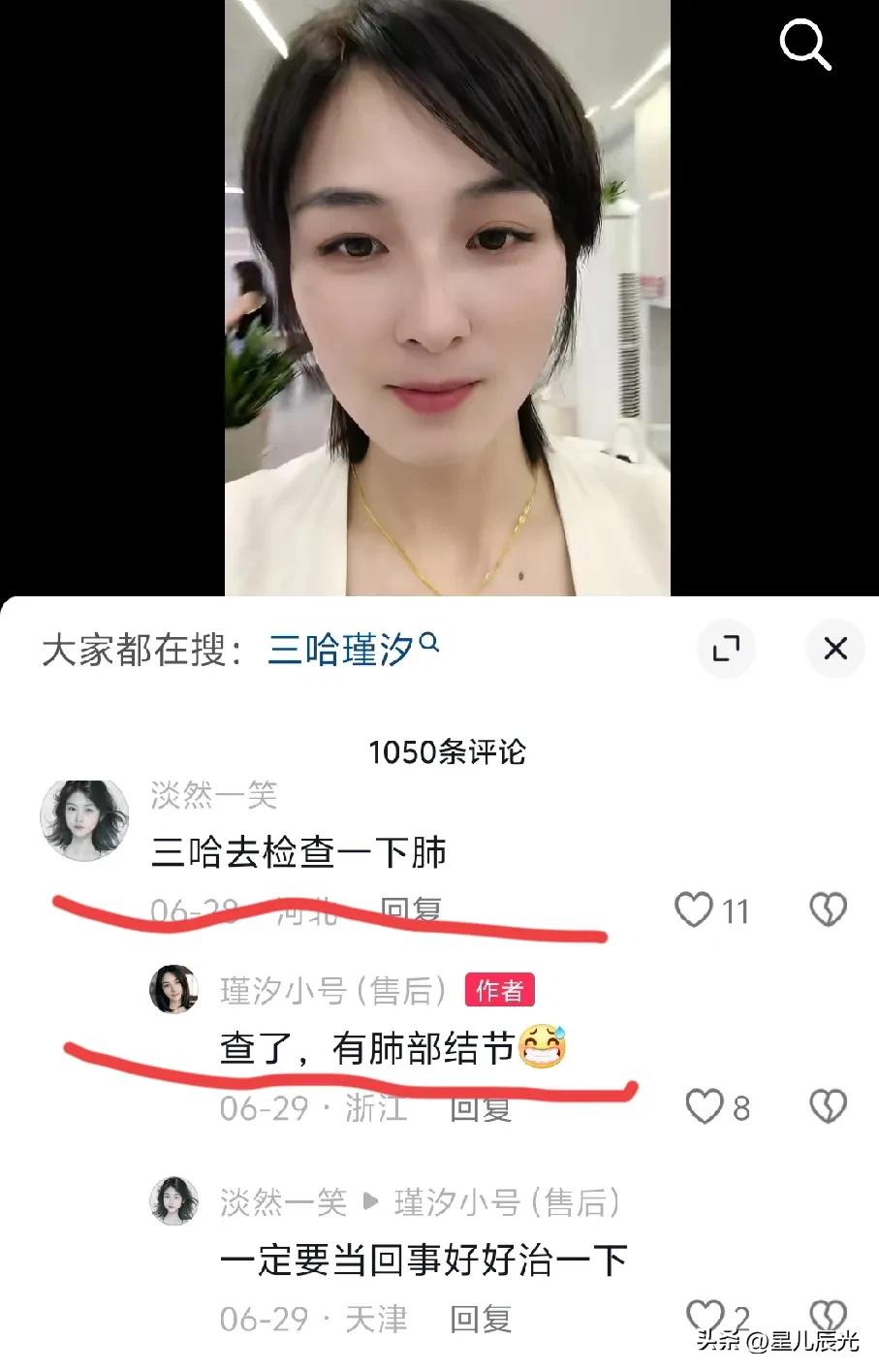 瑾汐直言自己肺部有结节, 她是用自己小号回复网友的,网友问她肺部做检查没有,她这样回复了网友。 瑾汐还真的是真诚,一般的网红都不会回复这方面问题。 瑾汐还初步决定八月份和大姐,二姐去意大利见大姐夫,大姐这么久没回意大利,三姐妹一起去意大利也挺好。到时小小哈也能见到自己的爸爸,而二哈也能见到自己在意大利的孩子。 二哈还很仗义,说如果大哈、三哈还有大姐夫出去玩,她就在意大利餐厅守店。 二哈还让网友猜自己两只手能拿几个红酒杯,最后她告诉大家是11个。