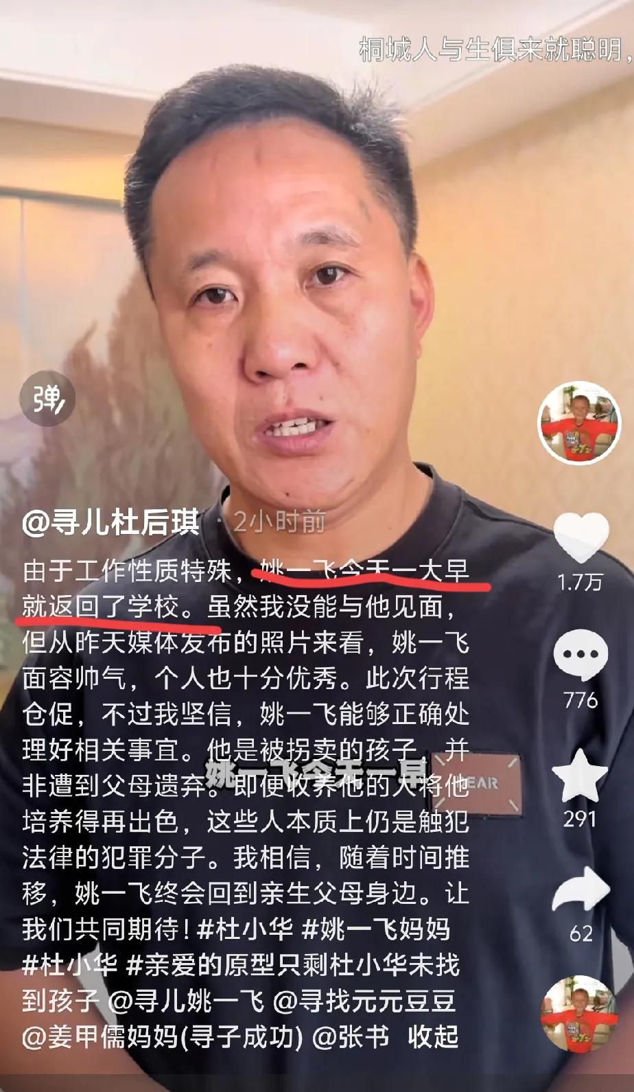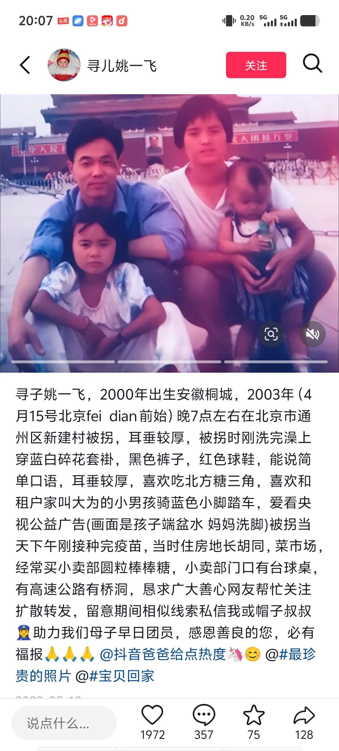 有网友问,姚一飞到底有兄弟姐妹没有?从姚一飞妈妈多年前发出的抖音视频可知,姚一飞还有一个姐姐。姚一飞是2000年出生,他于2001年在北京天安门广场和姐姐拍了一张合照。 合照里面,姐姐坐在爸爸的前面,姚一飞坐在妈妈的前面,手里还拿着一瓶饮料,一家人看起来很和谐,非常的幸福。 姚一飞姐姐从小由爷爷奶奶养大,姐姐很懂事,她居然和爸爸妈妈说过,以后考大学考到北京,这样她也能去北京找弟弟。弟弟是在北京丢失,所以姐姐才会说这样的话。 姚一飞妈妈发出的其它视频里,没有发过姐姐的有关信息,基本都是她的寻子视频,而且妈妈非常低调,我们都是从其他寻亲家庭或者媒体得知消息。 目前,姚一飞已经回学校,去了南京。