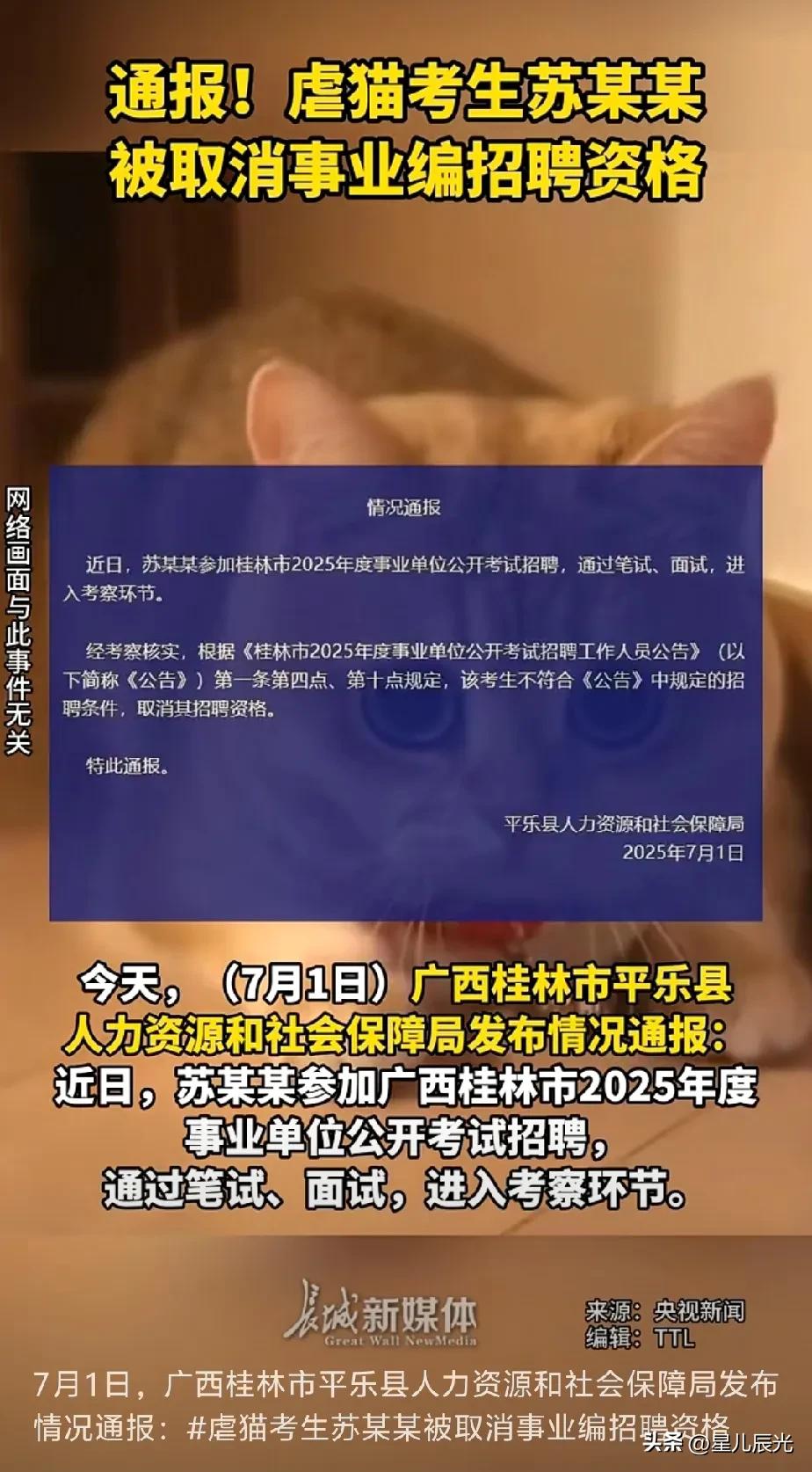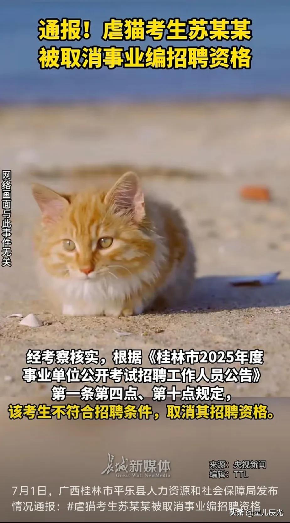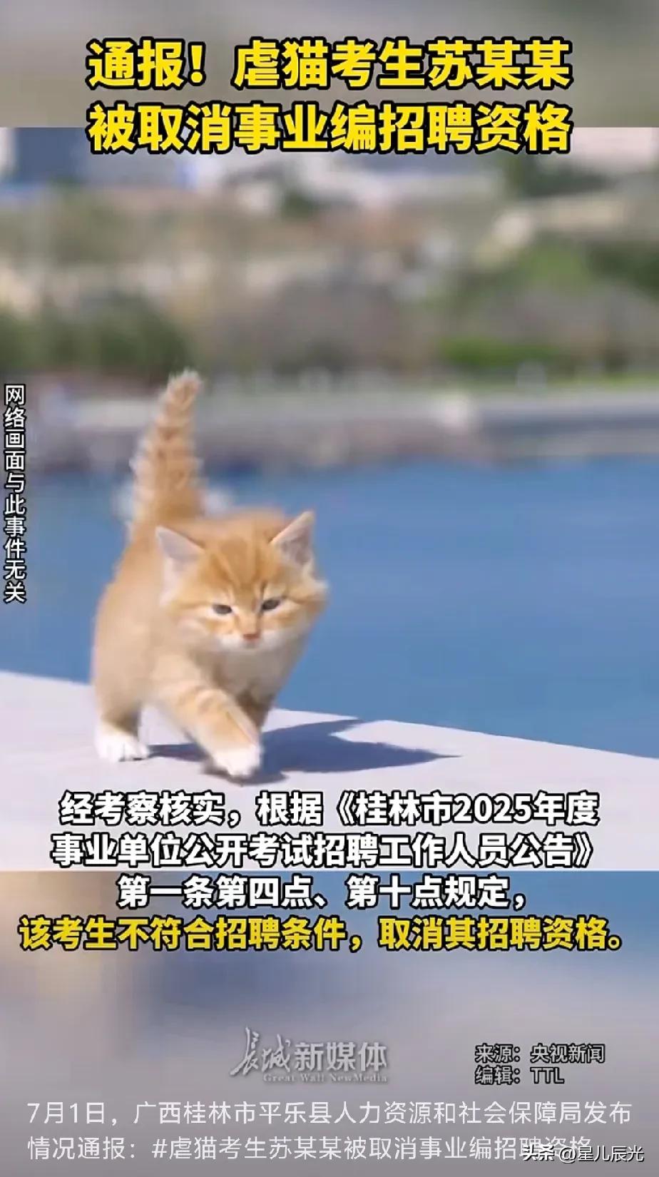现在全网最后悔的应该是因虐猫事件被取消招聘资格的苏某某,而且他考的还是事业编。他考的工作单位是桂林平乐县一个镇上的便民服务中心。 苏某某万万没想到因为公示的名字和虐猫事件名字相同而被人举报。他本来已经通过了笔试和面试环节。 流量是一把双刃剑,他本来发布那些关于虐猫事件的视频是想博取流量,增加自己的粉丝,成为网红,但没想到反被流量反噬,后来他的账号也被关闭。因为猫的生命也是生命,苏某某发布的视频已然引起了公愤。 几个月前我去老家的一个便民服务中心办事,也是在镇上,那个岗位平时工作量少,来办事的群众也不多。 而苏某某也因为自己的行为,错失了成为事业单位人员的机会。