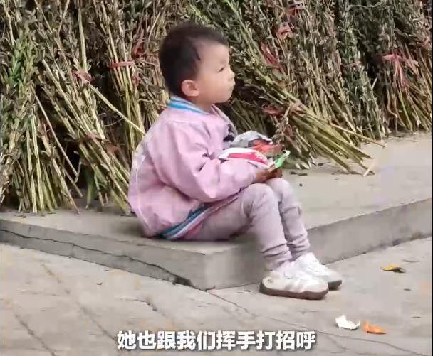 陕西,一位3岁小女孩坐在自家门口玩耍,这个时候看到一群来乡间拉练军训的大学生。小