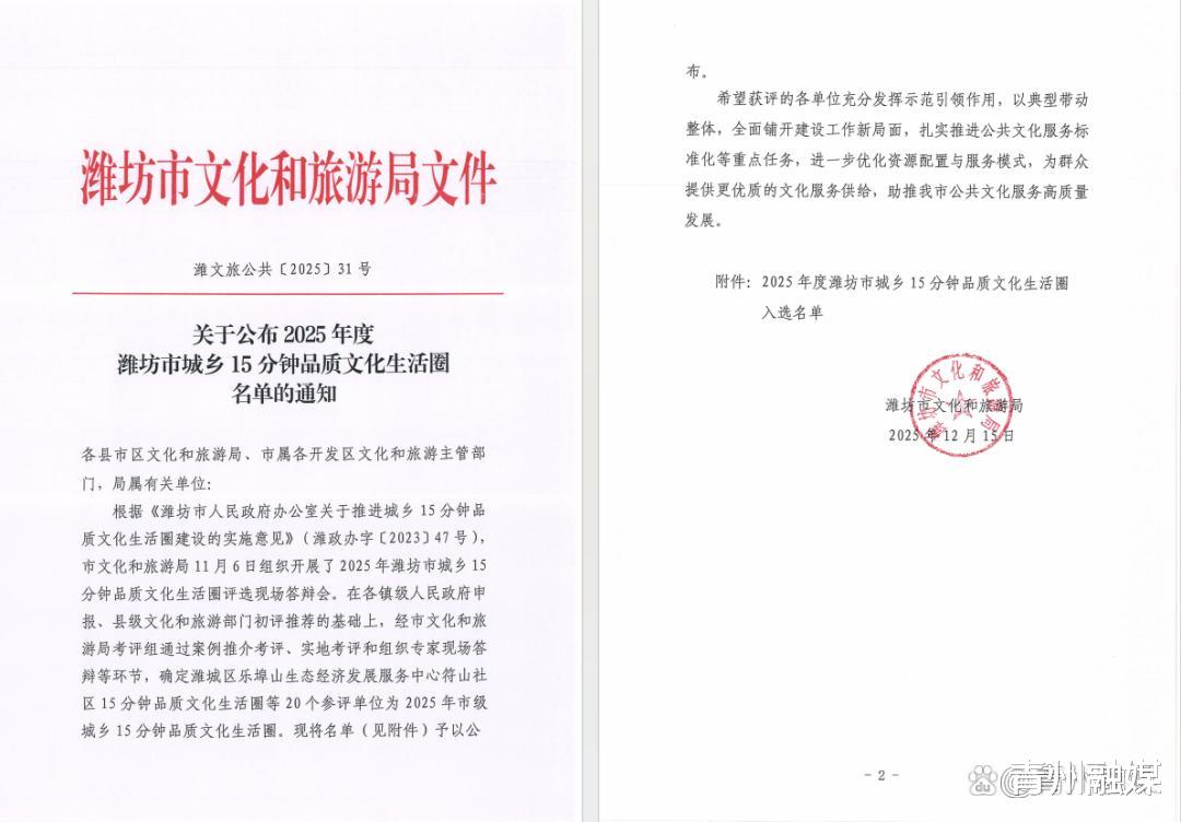 12月5日,潍坊市文化和旅游局公布了《2025年度潍坊市城乡15分钟品质文化生活圈名单》,青州市益都街道旗城社区、邵庄镇凤凰村凭借完善的文化设施、丰富的服务供给和鲜明的地域特色成功入选,成为青州推进公共文化服务均等化、品质化的生动实践。