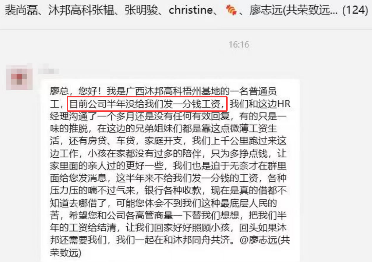 需要说明的是,赶碳号相关文章发布后,广西梧州拖欠员工工资的情况也暴露出来。沐邦广西梧州员工爆料:“2024年8月起已出现工资延迟发放情况,2024年12月至2025年5月,连续6个月全面停发工资及断缴五险一金,总额超1000万元,导致员工无力支付房租、医疗费及房贷车贷,多名员工因社保断缴无法报销高额住院费用。”