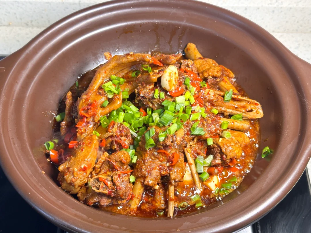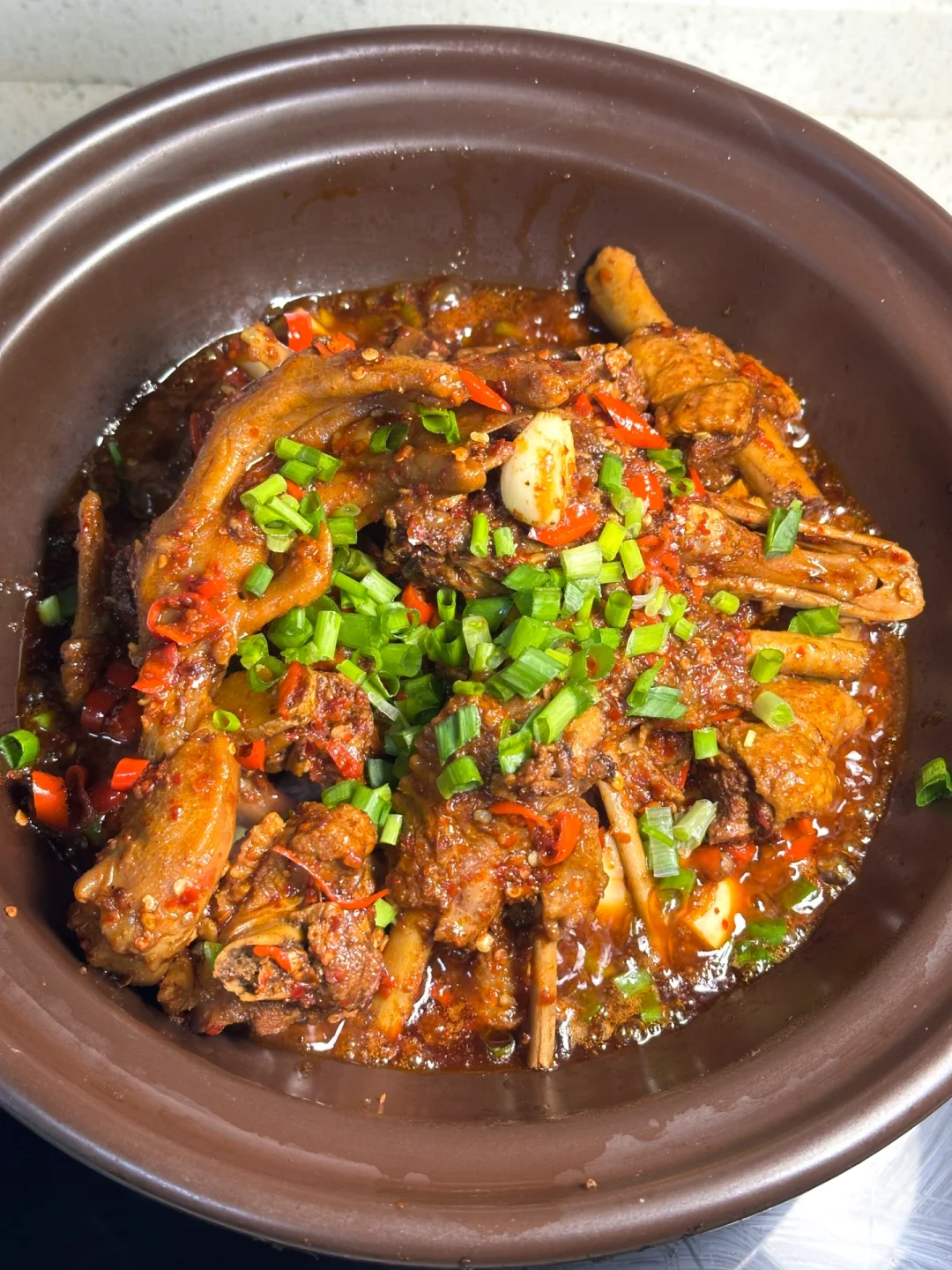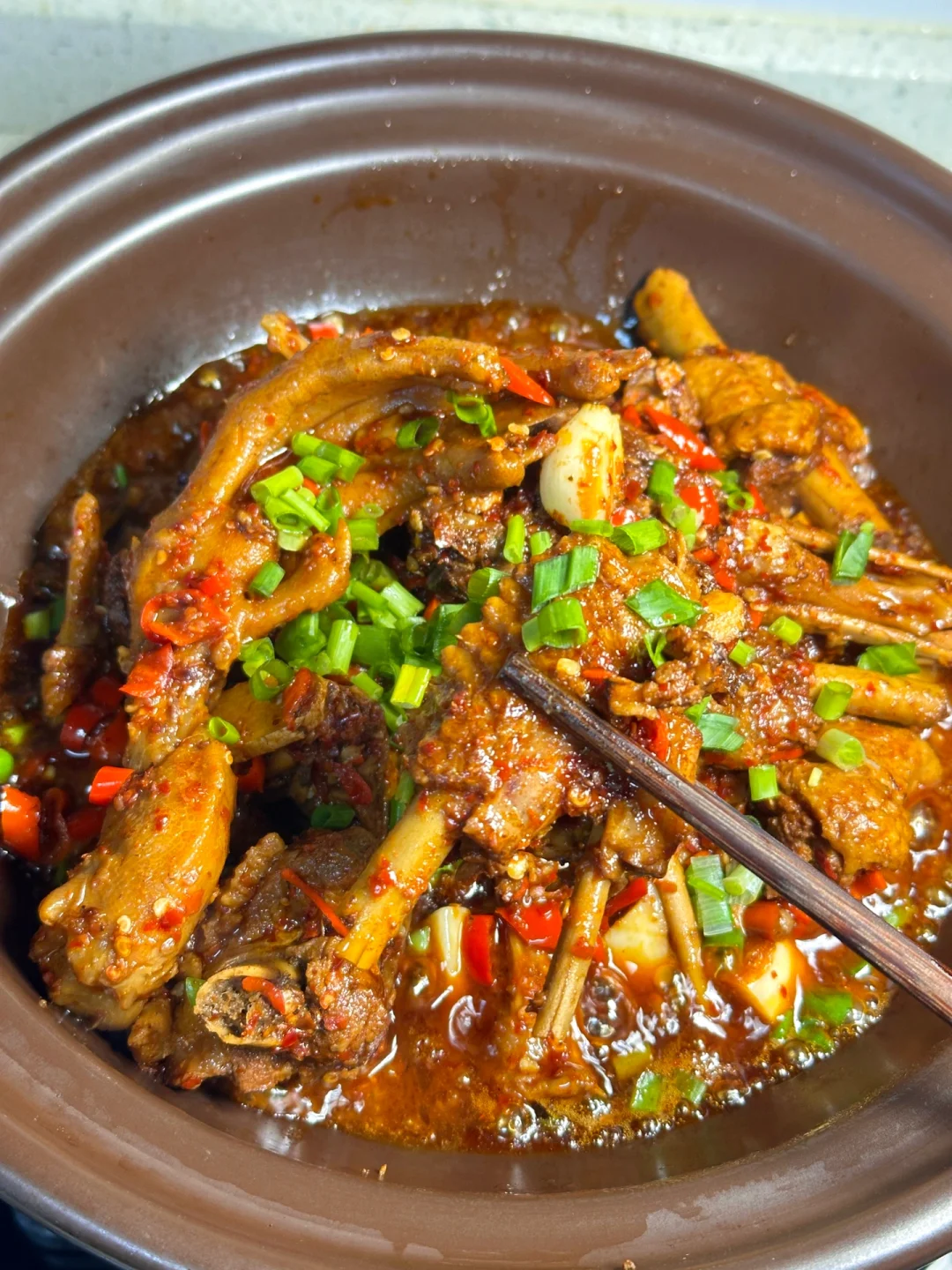 锅里倒油放姜蒜 小米椒 辣椒粉小火炒出红油,放鸭三件翻炒几下,倒入提前备好的汤汁,放一小勺鸡精 一甩蚝油中火煮五分钟入味,起锅前大火收汁 撒上葱花