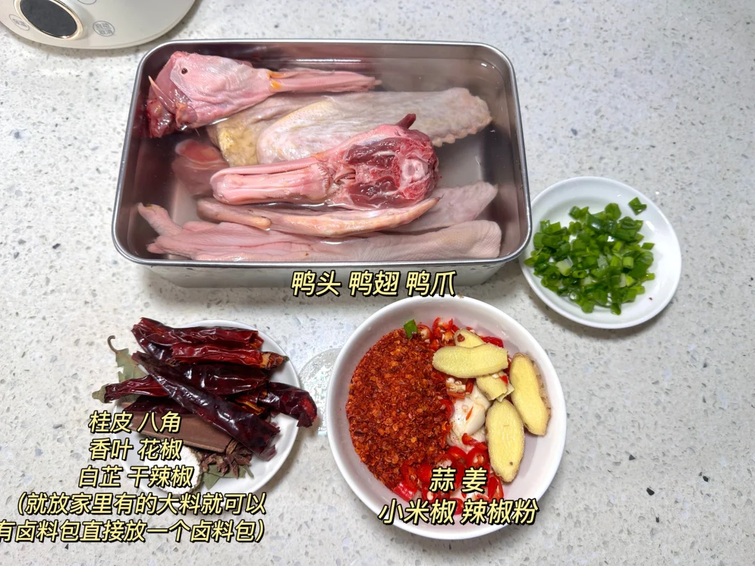 ✨食材:鸭头 鸭翅 鸭爪 姜片 蒜粒 小米椒 辣椒粉 干辣椒 桂皮 八角 香叶 花椒 白芷 (有卤料包用卤料包)葱花