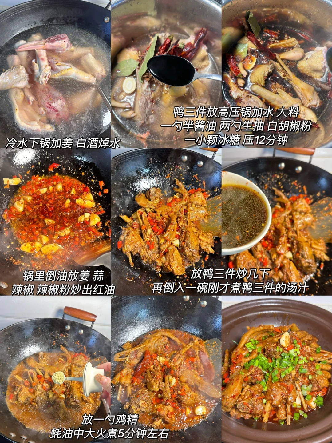 1️⃣:我买的新鲜的鸭三件,提前泡了一小时血水。再冷水下锅加姜片,白酒焯水,水开后煮两分钟夹出来再用流动的水多冲洗几遍。鸭三件放高压锅里加水 准备好的大料,干辣椒,一勺半酱油 两勺生抽 ,白胡椒粉 一小颗冰糖压12分钟。