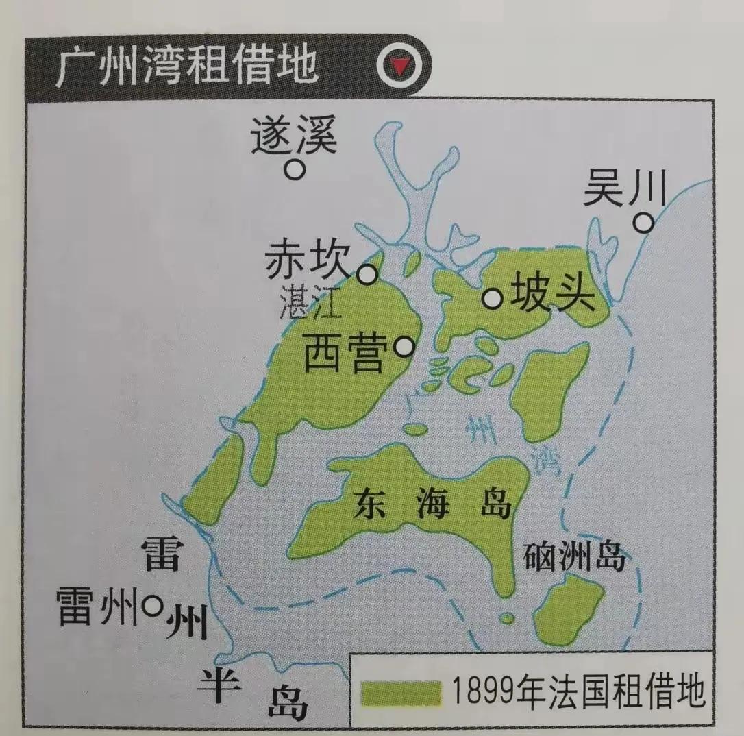 广州湾,法国于1899年租借,包括霞山、东海岛、硇洲岛、坡头等地。 其实,广州