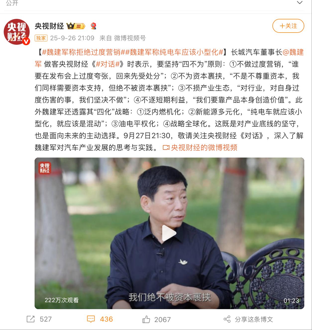 在 9 月 27 日晚的央视《对话》栏目中,长城汽车董事长魏建军表示,要坚持“四不为”原则: 1、不做过度营销,“谁要在发布会上过度夸张,回来先受处分”; 2、不为资本裹挟,“不是不尊重资本,我们同样需要资本支持,但绝不被资本裹挟”; 3、不损产业生态,“对行业,对自身过度伤害的事,我们坚决不做”; 4、不逐短期利益,“我们要靠产品本身创造价值”。