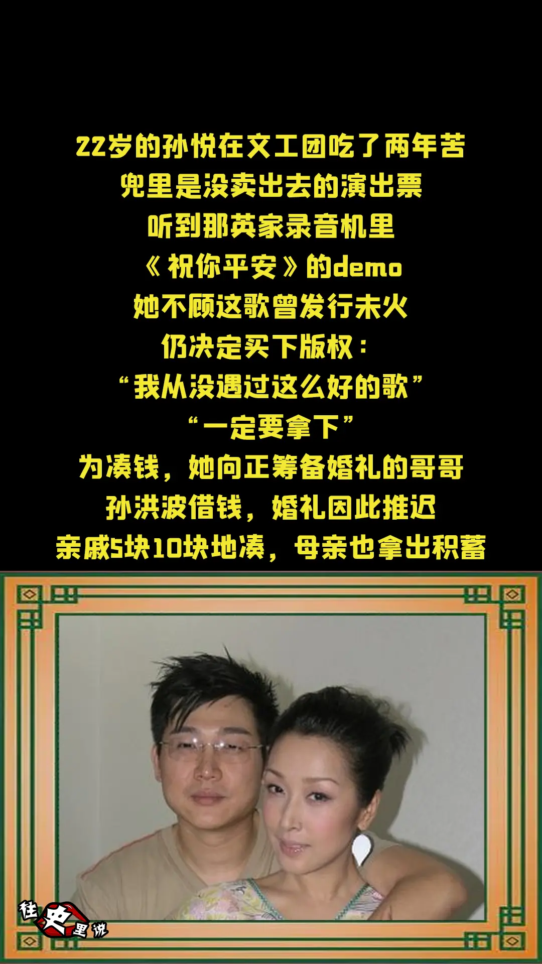 1994年,孙悦为了买下《祝你平安》这首歌,硬着头皮找人借钱:“哥,你能不能先别结婚,我缺10万块钱。” 孙悦就这样向亲朋好友借了一遍,凑够了10万,去作曲家刘青那,买下了《祝你平安》版权。