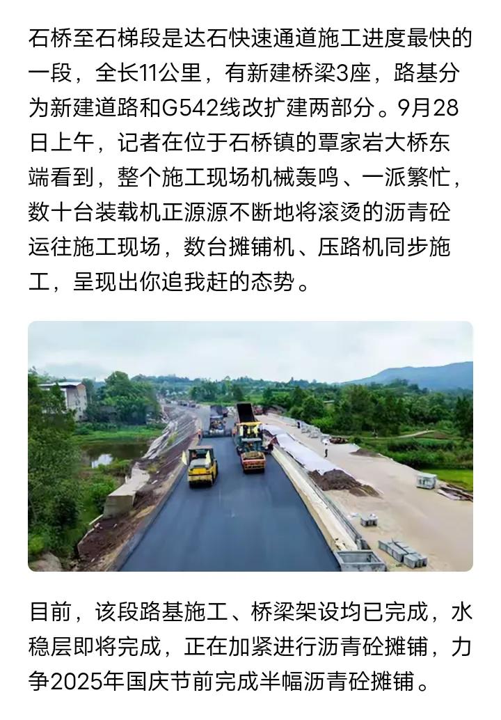 好消息,达州至石桥镇的快速路石梯至石桥镇的11公里正在进行沥青摊铺,全线控制性工程巴河特大桥正在冲刺合龙,预计年底或2026年春节前有望建成通车,届时春节期间达州城区开车来往石梯和石桥还有平昌等地将更加顺畅,相比走542国道更加省时省力省油,达石快速通道全长约37.5公里,起于管村镇和大堰镇附近,一边接542国道一边接达州绕城高速西段,未来或将直接通过铁山隧道直连城区,止于石桥镇平昌界,双向四车道一级公路标准,设计时速60公里每小时,如果能全线安装路灯那就更完美了,全线建成通车后将极大方便沿途乡镇群众开车来往达州。