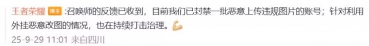 昨日,《王者荣耀》官方回应此事,表示已经封禁一批恶意上传违规图片的账号,也会持续打击利用外挂恶意改图的情况。