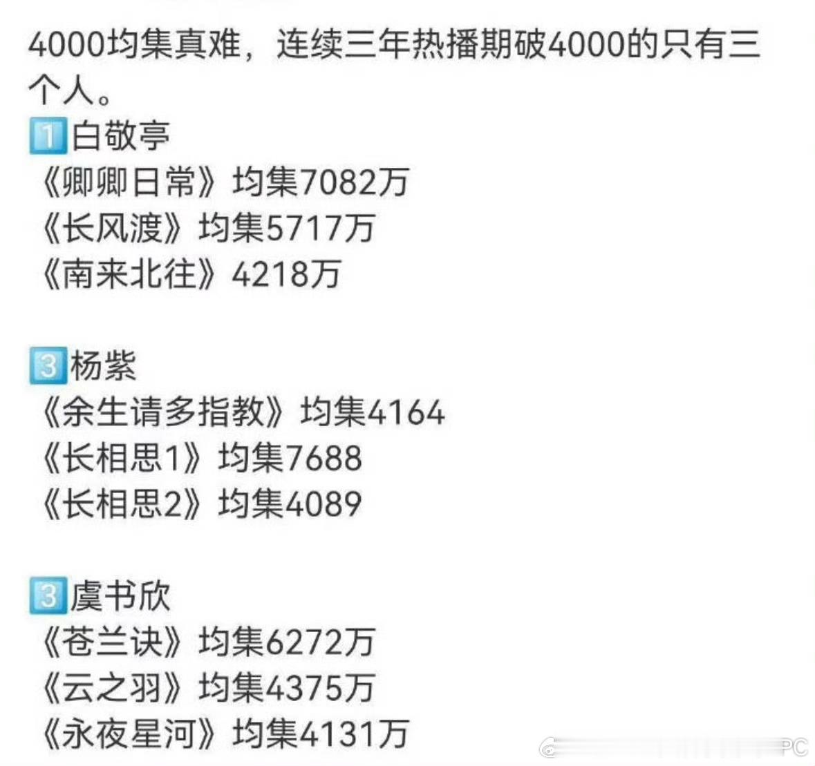 连续三年热播期破4000集均的竟然只有三个:白敬亭杨紫虞书欣