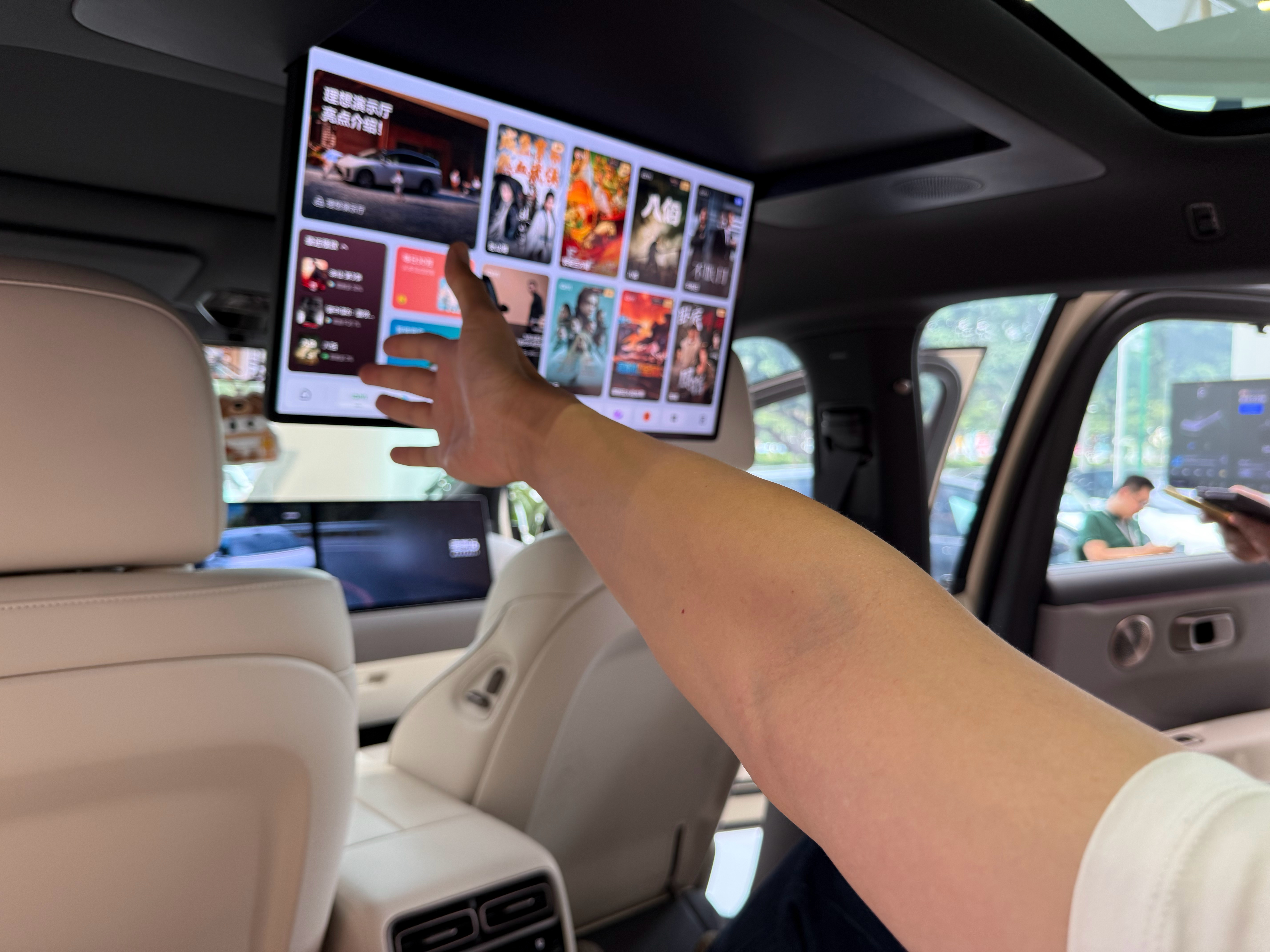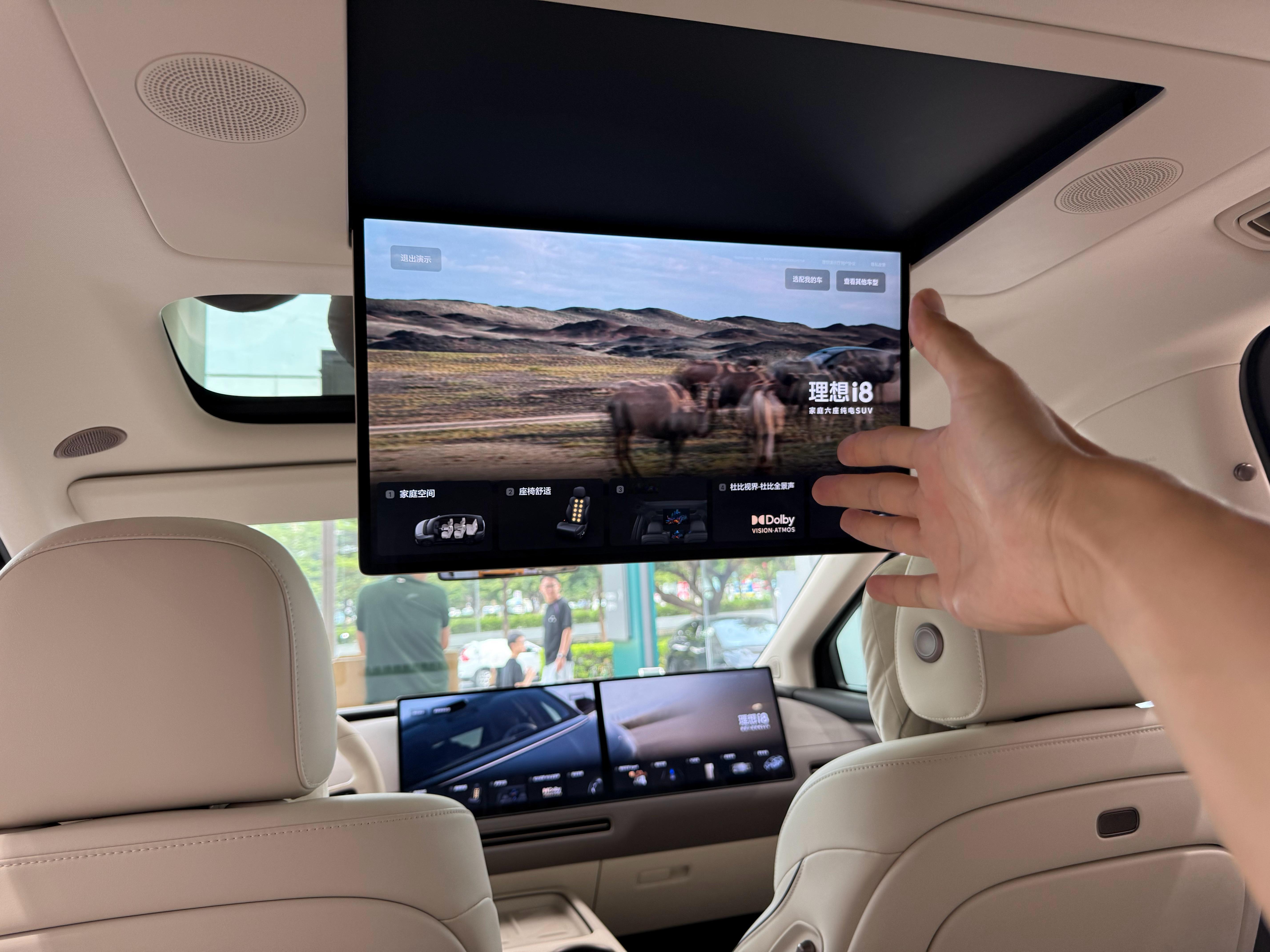 21.4英寸的电视,在 i8 上把二排座椅调到最后、角度调躺,是可以找到合适的观影距离的,