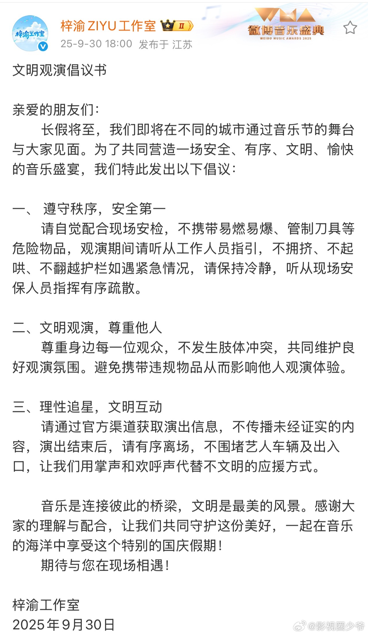 梓渝工作室发了文明观演倡议书!请去泸州银河左岸的Yuni们文明观演!注意安全!并
