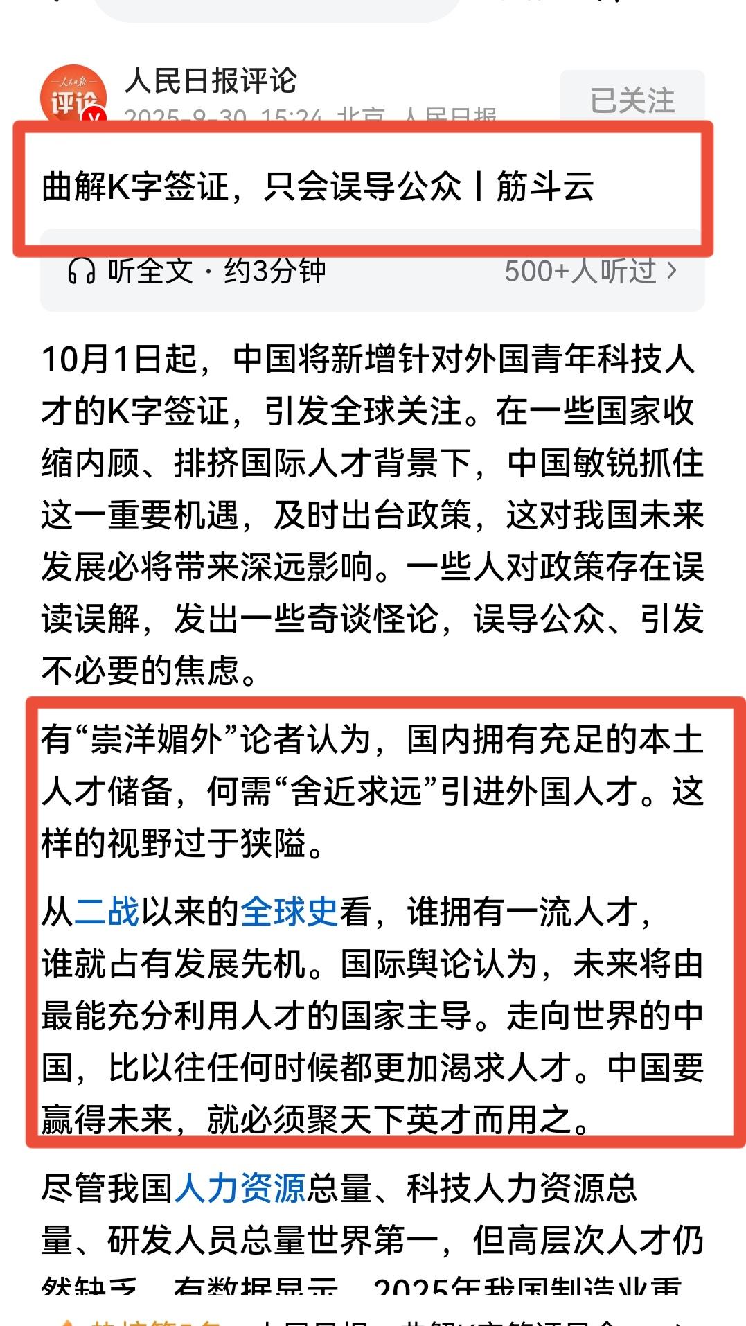 人民日报发声,曲解k字签,只会误导公众! 1、人民日报强调作出决策的背景,我们的k字签,是在美国排挤国际人才的情况下,顺势做出的决策,将会对中国的发展带来深远影响。 2、人民日报强调,那些认为国内有充足人才,还舍近求远引进外国人才,这些人眼光狭隘。 3、人民日报强调,只有聚天下英才而用之,我们才能抢占发展先机。 4、人民日报强调,我国高层次人才缺乏,其中制造业重点领域人才缺口近3000万,中国容得下各类人才。 5、人民日报强调,我们招揽的是外国青年高科技人才,必须是境外知名高校以及科研机构,这样的人才世界上本就很少,各国抢着要,多多益善,根本不会出现冲击国内就业的状况。 6、人民日报强调,K字签不是移民,不会出现所谓移民危机。 7、人民日报强调,我们是世界上最安全的国家,有强大的治理能力,所谓的害怕“潜在风险的人”会造成安全隐患,是对治理能力的不自信。 总之,人民日报强调,K字签是顺应时势,百利而无一害。