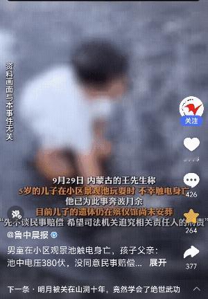 “太可惜了!”内蒙古通辽市,一5岁男孩子在小区的景观池触电身亡,孩子他爸不同意民