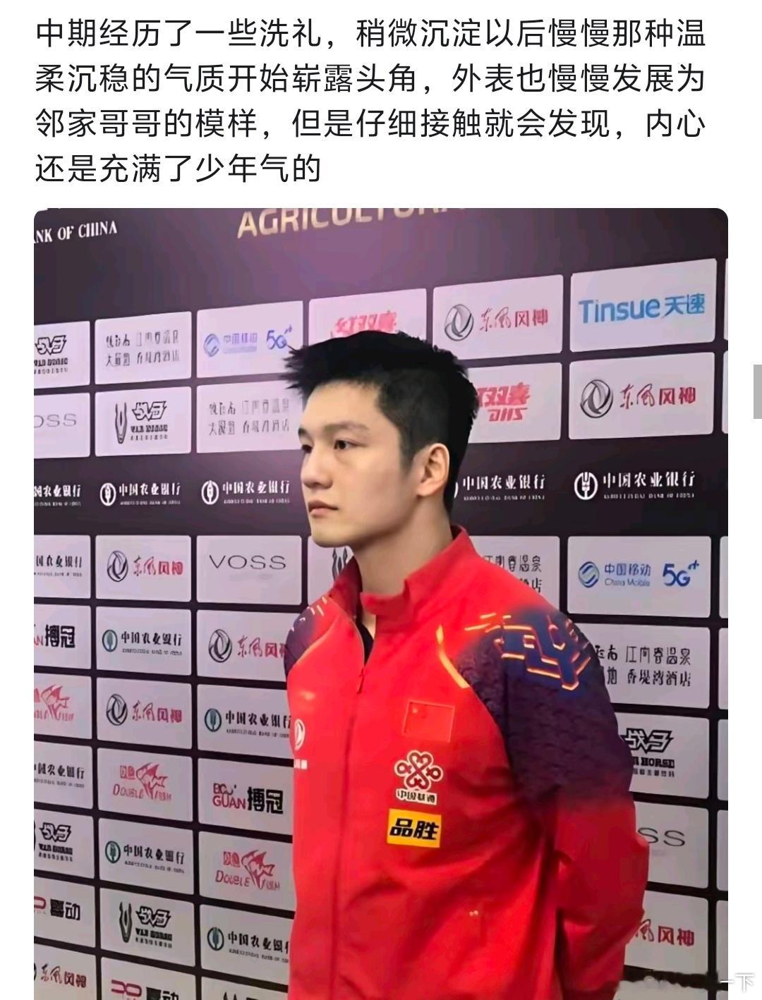 对樊振东而言,帅只是附加项,骨子里的阳刚才是核心。内敛中藏着温柔,强悍中带着锋芒