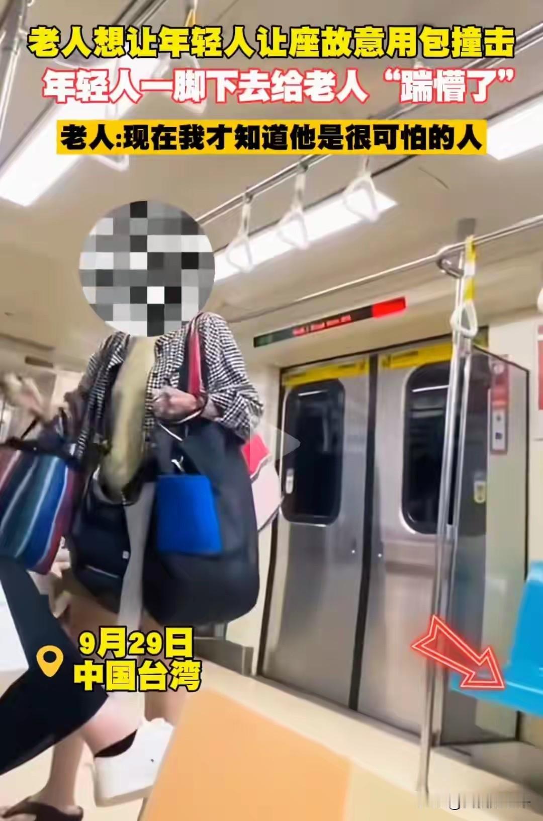 看看吧,这就是弯弯的素质,碰瓷老人遇到了暴躁小伙! 近日台北地铁,人家叫捷运,发生了一起让人瞠目结舌的事情。 一名老人拿着包故意碰撞一名年轻人,并且要求年轻人给他让座。 可是我们看照片和视频,这名老人背后就有空座啊! 有空坐不坐,你为什么强迫别人给你让座? 还用包故意去撞人家,结果年轻人也没废话。 把自己的包放在一边,上去就是一脚! 老人倒是没有被踹倒,但是显然是被踢懵了! 他可能是万万没有想到,年轻人居然真的敢动手! 但是这一脚下去之后,这位老人突然变得通情达理了! 他就是在那嘀咕,我没想到他是这么可怕的人,我没想到他是这么可怕的人。 你想到没想到又能怎么样呢?有空座你不坐你非得抢别人的? 果然是神鬼怕恶人啊!这个老人到后面居然没有碰瓷儿,而是灰溜溜的走了! 其实这就是碰瓷的本质,他赌的你就是一个好人,如果你一瞬间展示出恶人的状态。 他马上就傻了! 因为他很清楚,也许在法律冲过来保护他之前,他就已经被打死或者打残了! 你看看那些跑小轿车底下故意躺倒碰瓷的,他们从来不敢碰瓷那些满脸横肉浑身纹身的道上大哥。 他们见到这些人,赶紧躲着走。 碰瓷儿都是找着那些斯文老实的人欺负。 因为他们只是想碰瓷而已,不是想丢命。 神鬼怕恶人啊,遇到横的愣的他也知道保命优先。 年轻人这一脚直接让老人变得通情达理了! 但是心净在这里要强调,不要学这样的年轻人。 人生一世,柔和一点!没有必要所有事情都硬碰硬。 其实每一天所经历的事情,不论喜怒哀乐。 都是人生旅途上的一段风景而已。 过去了就过去了。 过去之心不可得,未来之心不可得,同样的现在之心也不可得! 没有必要那么大的戾气,静看花开花谢,坐看云卷云舒!