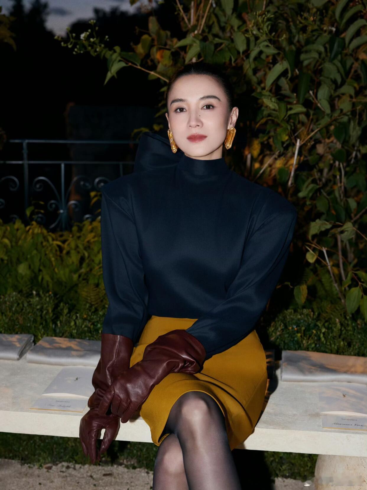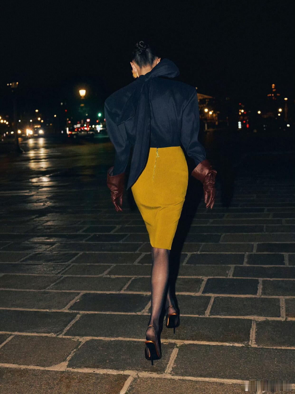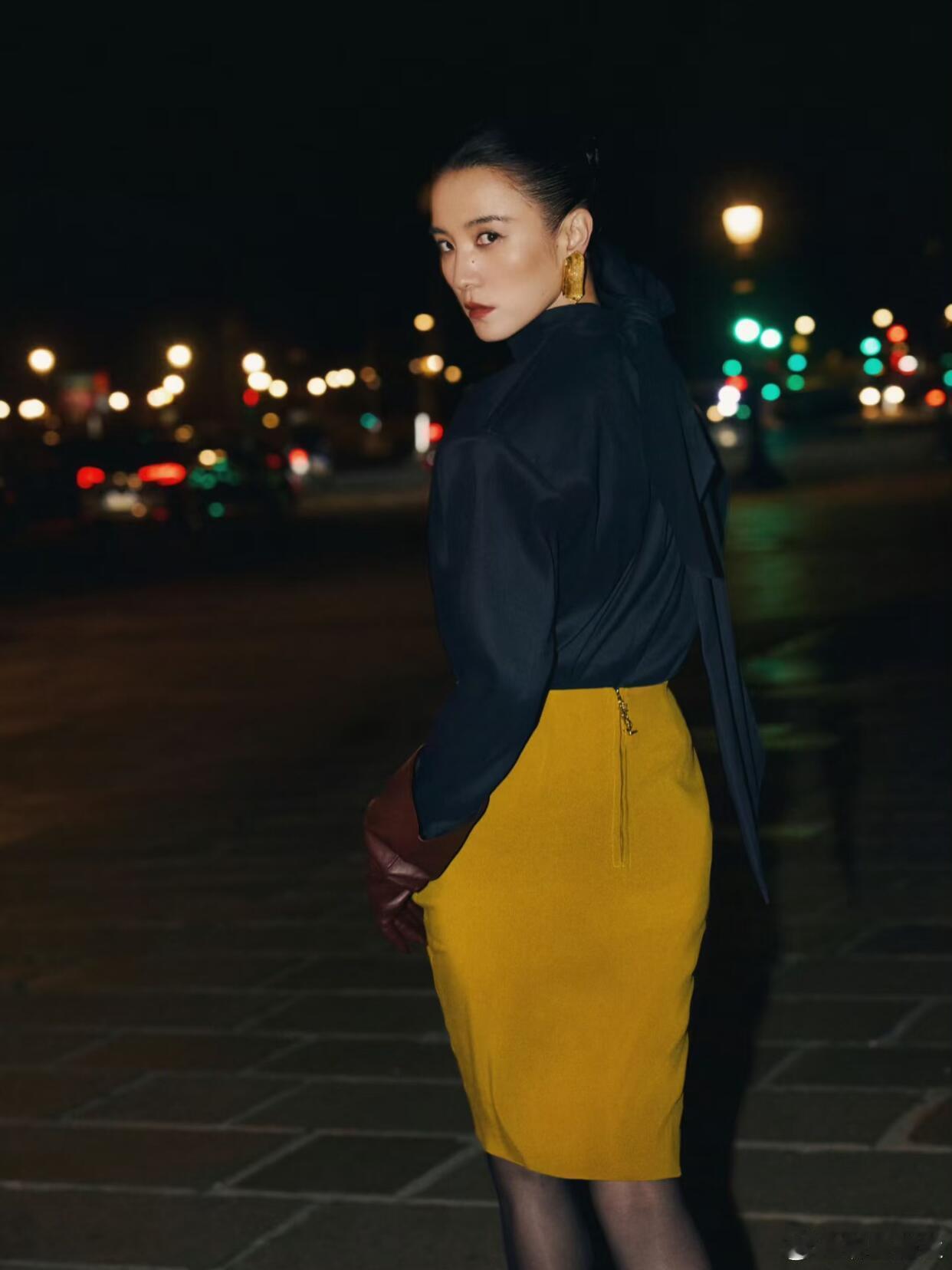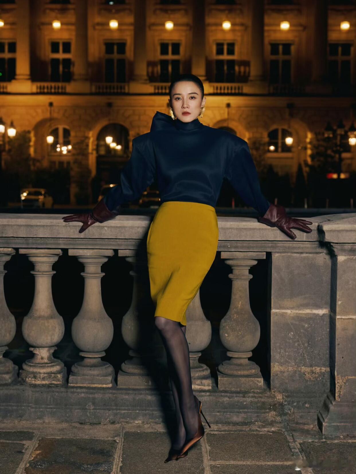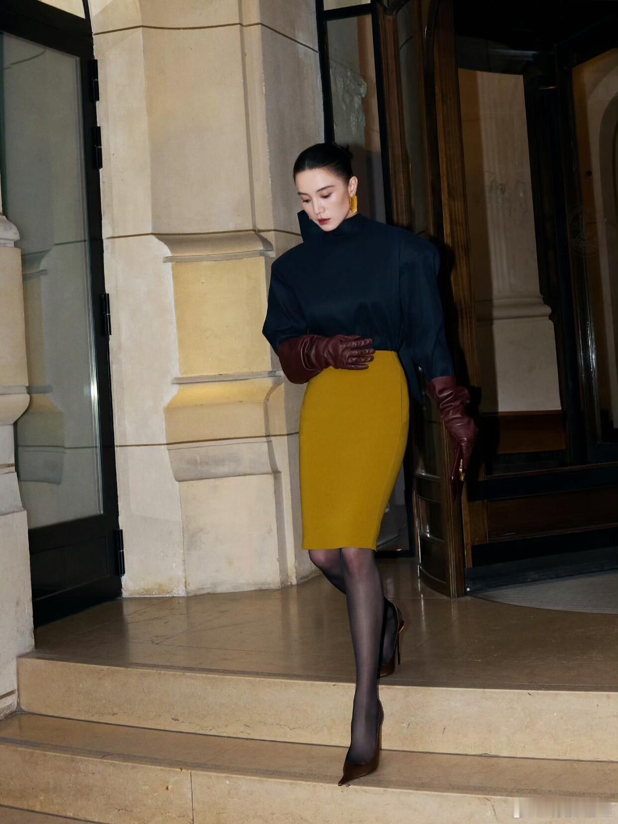 宋佳这组巴黎时装周造型太戳人了!一身圣罗兰穿搭,深蓝色立领上衣搭配姜黄色包臀裙,色彩碰撞高级又吸睛。棕红色皮手套和金属色尖头高跟鞋的搭配,复古感拉满,再加上黑丝的点缀,把法式女郎的优雅与性感平衡得恰到好处